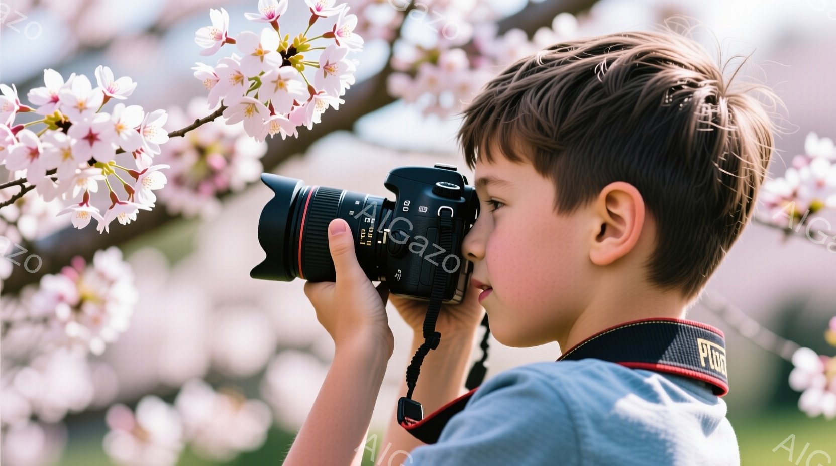 少年は桜の花を背景に、一眼レフカメラで何かを撮影しています。黒い髪の少年は、赤いストラップのついたカメラを構え、真剣な表情でファインダーを覗き込んでいます。背景には、淡いピンク色の桜が咲き誇り、春の暖かく穏やかな雰囲気を醸し出しています。