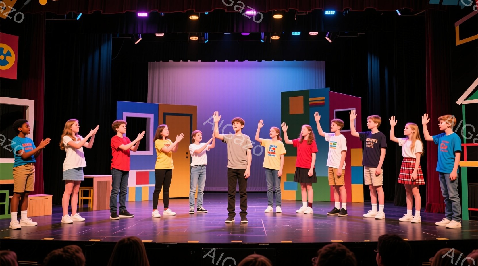 舞台の上で、子供たちがカラフルな背景の前で整列している。少年は両手を上げて中央に立ち、他の子供たちは拍手をしているように見える。背景には、ピンク、黄色、青、緑の正方形のパネルや、三角形の旗が飾られたガーランドがあり、全体的に明るく活気のある雰囲気である。