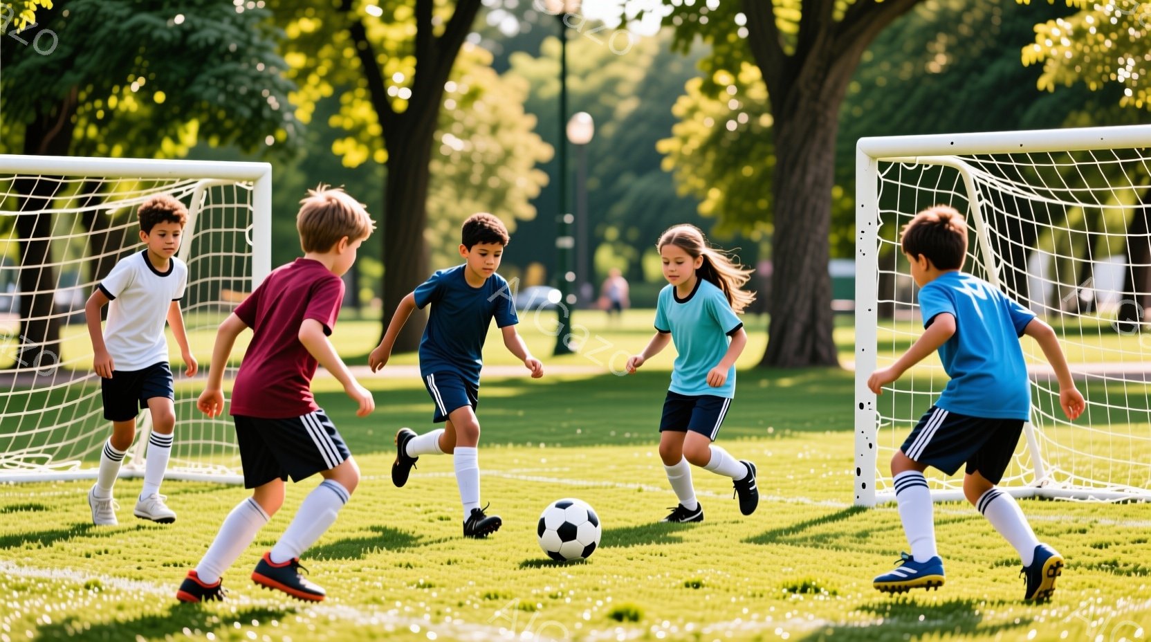 少年少女4人が緑の芝生の上でサッカーをしている様子が写っている。赤紫色のシャツに黒のショートパンツの少年、水色のシャツとショートパンツの少年、赤紫色のシャツと黒のショートパンツの少女、水色のシャツと黒のショートパンツの少女が、それぞれボールを追いかけたり、ボールに向かって走ったりしている。背景には木々が生い茂り、晴れた空の下で、活気ある雰囲気の屋外サッカーの様子が捉えられている。