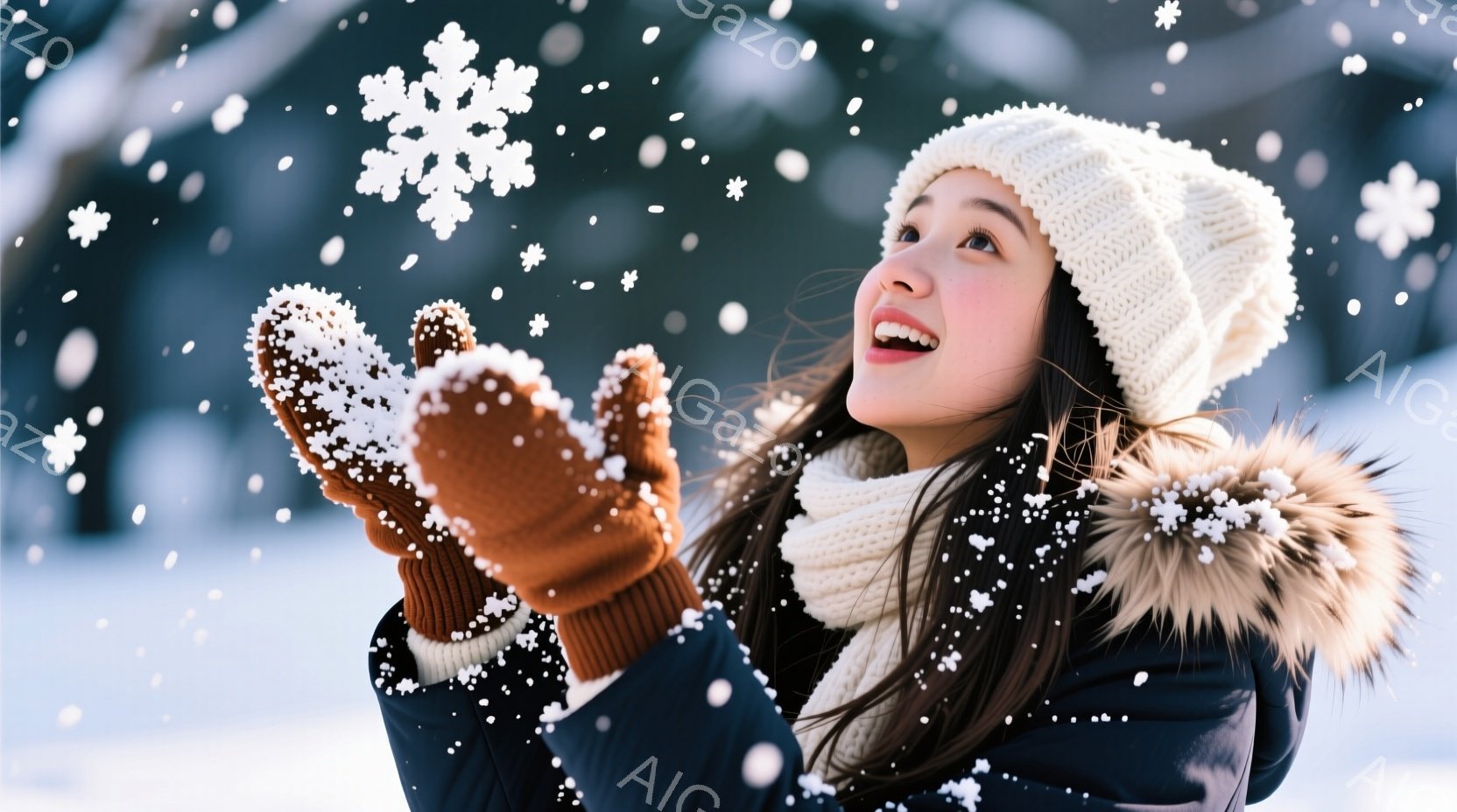 長い黒髪の女性が雪の中、赤い手袋を広げて雪片をキャッチしようとしています。白いニットのセーターとマフラーを身につけ、少し上目遣いで微笑んでおり、冬の暖かさと楽しさを表現しています。背景はぼやけていますが、雪景色が広がり、穏やかで幻想的な雰囲気を醸し出しています。