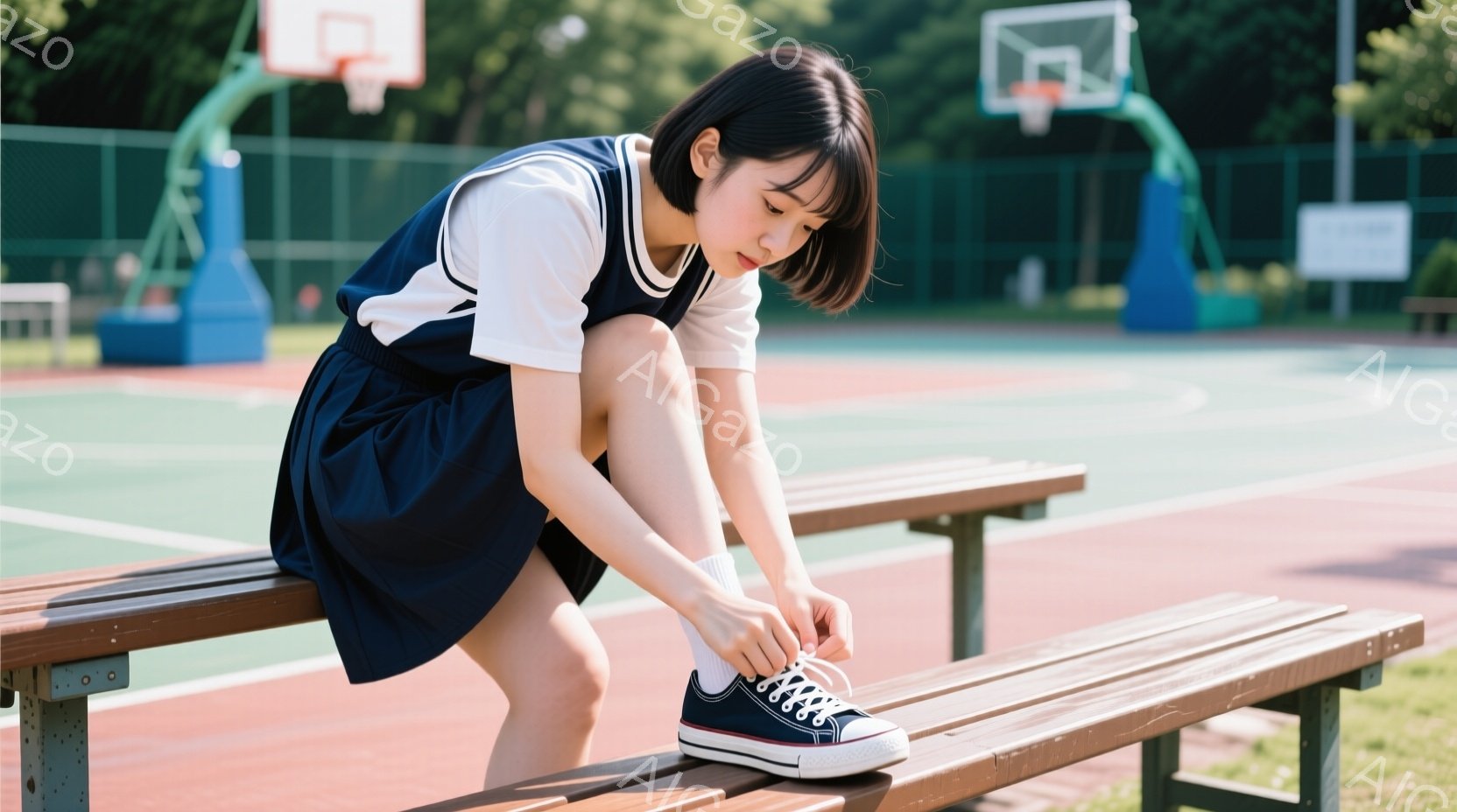短い黒髪の少女が、屋外のバスケットボールコートに設置されたベンチに座り、スニーカーの靴紐を結んでいます。白いTシャツに紺色のスカートを着用しており、姿勢は少し前かがみです。背景には緑豊かな木々があり、晴れた日の穏やかな雰囲気が伝わってきます。