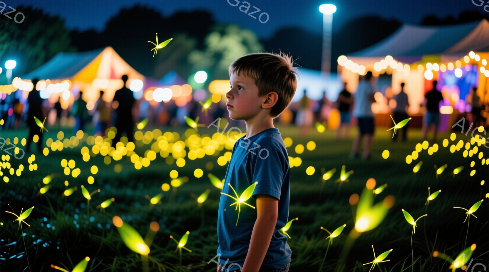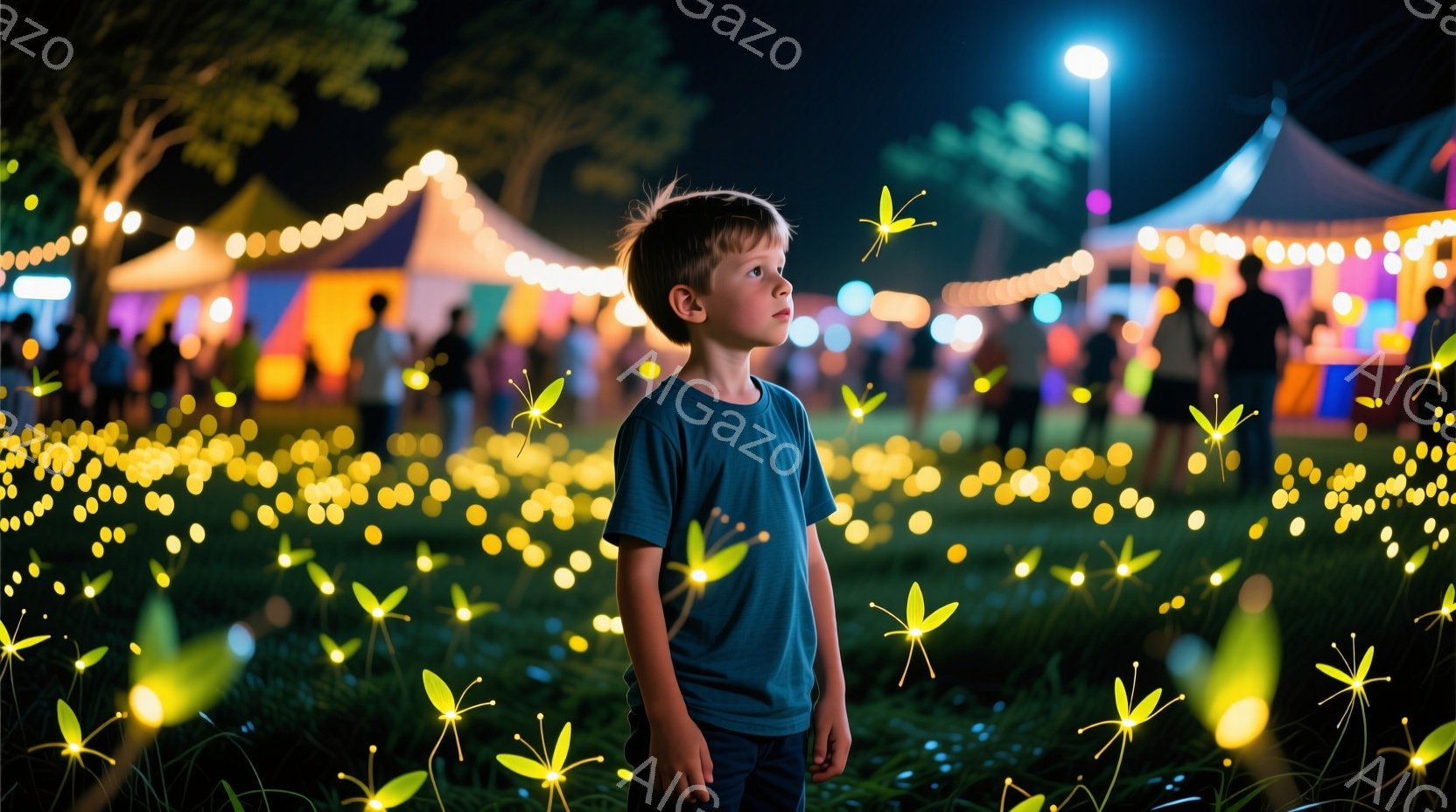 少年は青いTシャツとベージュ色のズボンを着用し、少し上を見つめています。周囲には無数の光る蛍が舞い、背景にはぼんやりと屋台や人々が見える夜の風景が広がっています。幻想的で少し物憂げな雰囲気が漂い、夏の夜の思い出を呼び起こさせるような光景です。