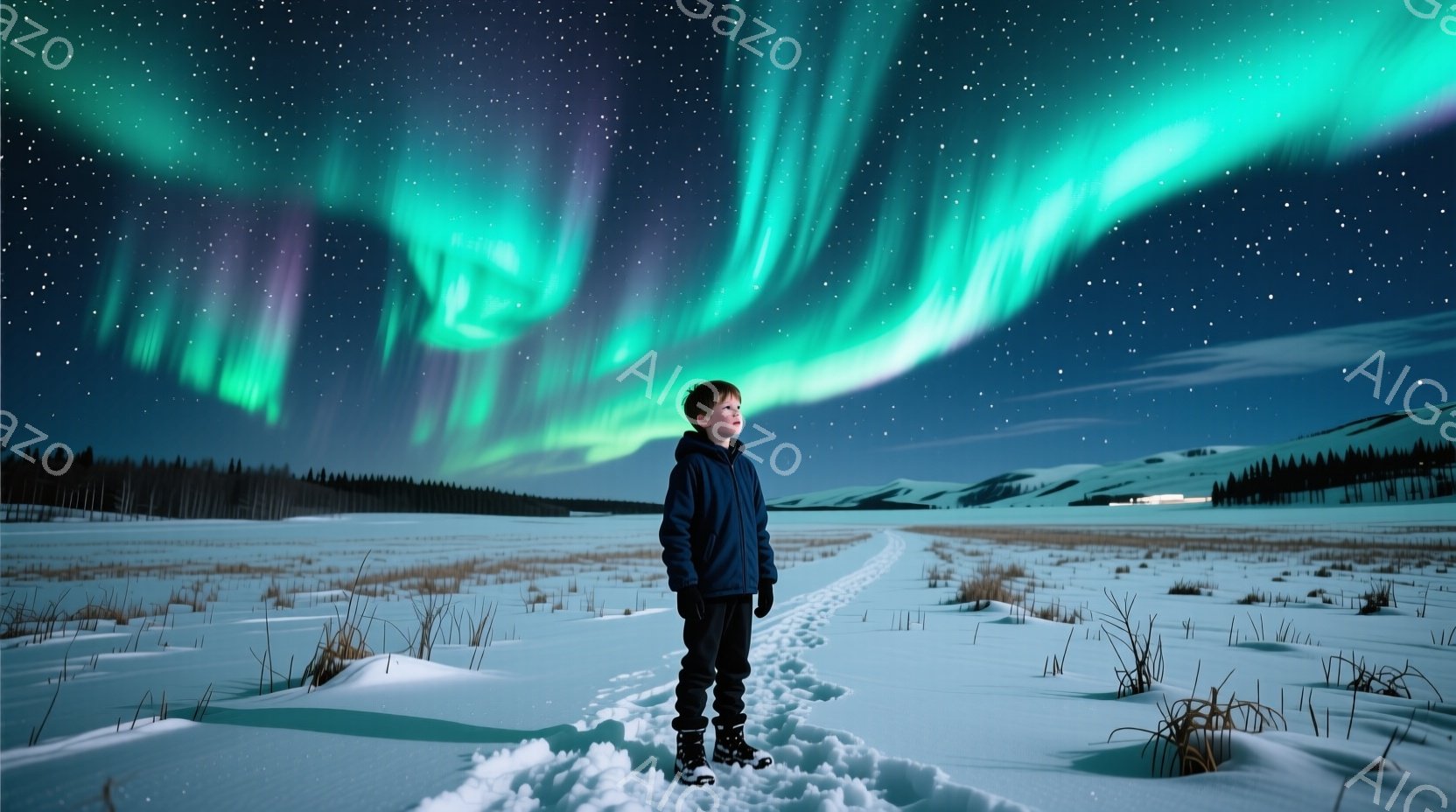 少年は雪原の中央に立ち、青と黒のジャケットとズボン、手袋を着用し、短髪で表情は穏やかである。背景にはうっすらと針葉樹林が見え、夜空には緑色のオーロラが壮大に広がっている。全体的に、静かで神秘的な冬の夜の雰囲気が漂っている。