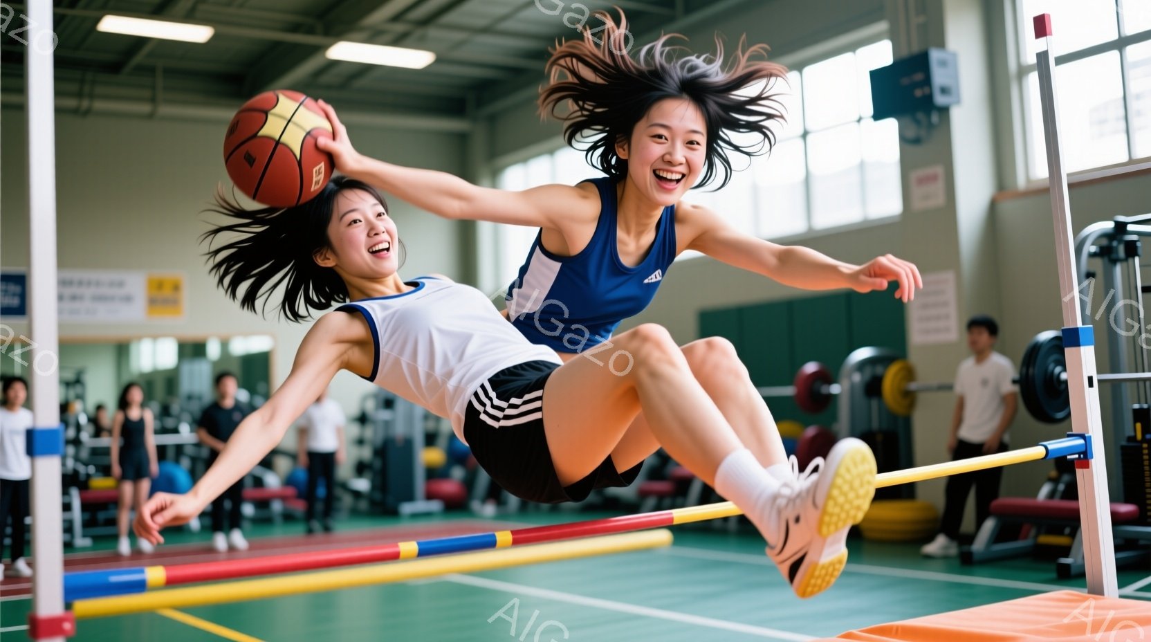 若い女性が、体操競技のバーを飛び越えようとしている瞬間が捉えられています。彼女は黒のスポーツブラとショーツ、白いスニーカーを着用し、髪を高いポニーテールに結んでいます。背景には、様々な体操器具やマットが配置された体育館が見え、活気のあるトレーニングの雰囲気が伝わってきます。