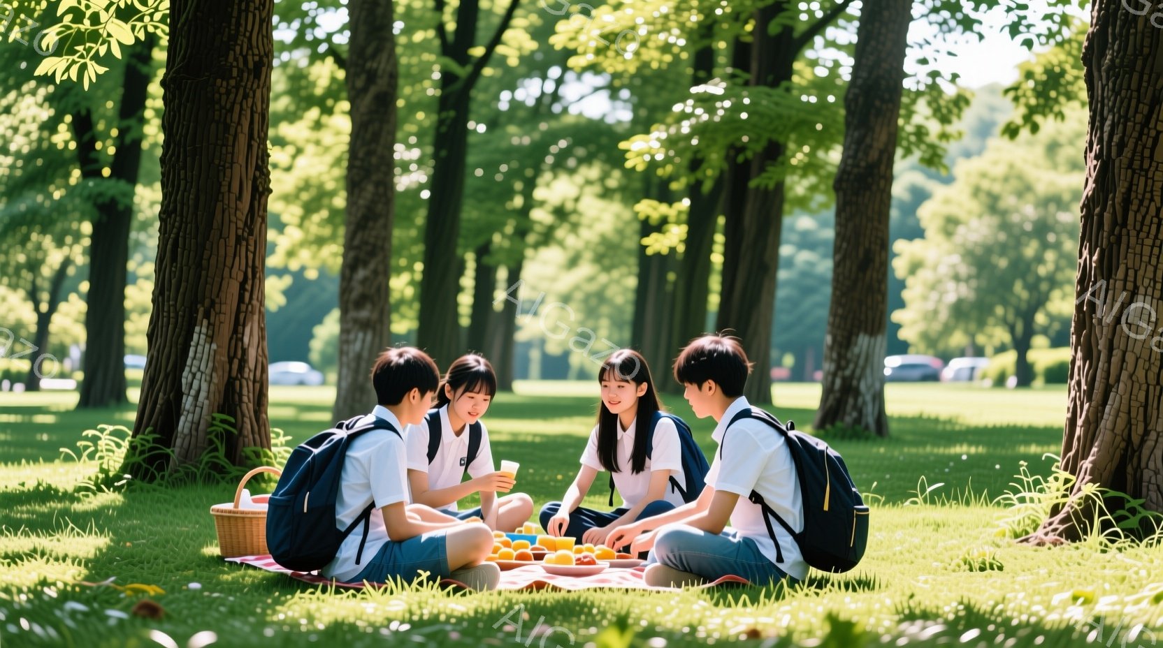 公園の緑豊かな芝生の上で、若い男女4人がピクニックを楽しんでいる様子が写っている。彼らは皆白いシャツに、カジュアルな服装で、リュックサックを背負っている。笑顔で飲み物を片手に談笑しており、晴れた日の穏やかで楽しい雰囲気が伝わってくる。
