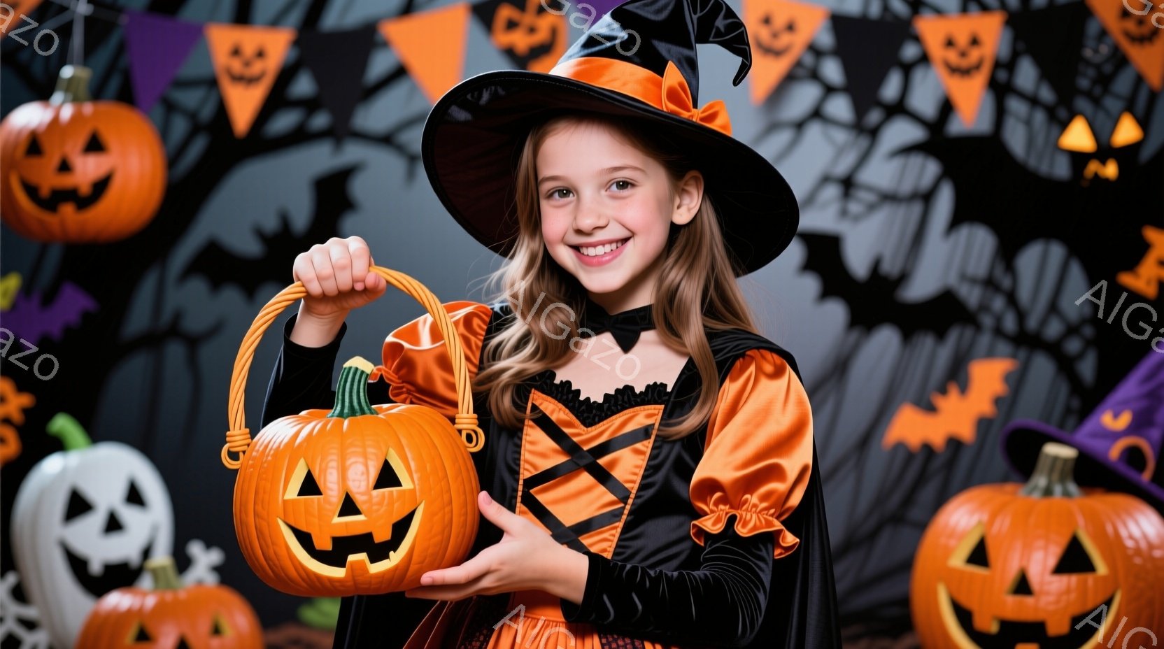 紫色の衣装と黒い魔女帽子を身に着けた少女が、ジャック・オー・ランタンを抱えています。彼女は微笑んでおり、ハロウィーンの雰囲気を楽しんでいるようです。背景には、さまざまな形のオレンジ色の装飾と、他のジャック・オー・ランタンが並んでいます。