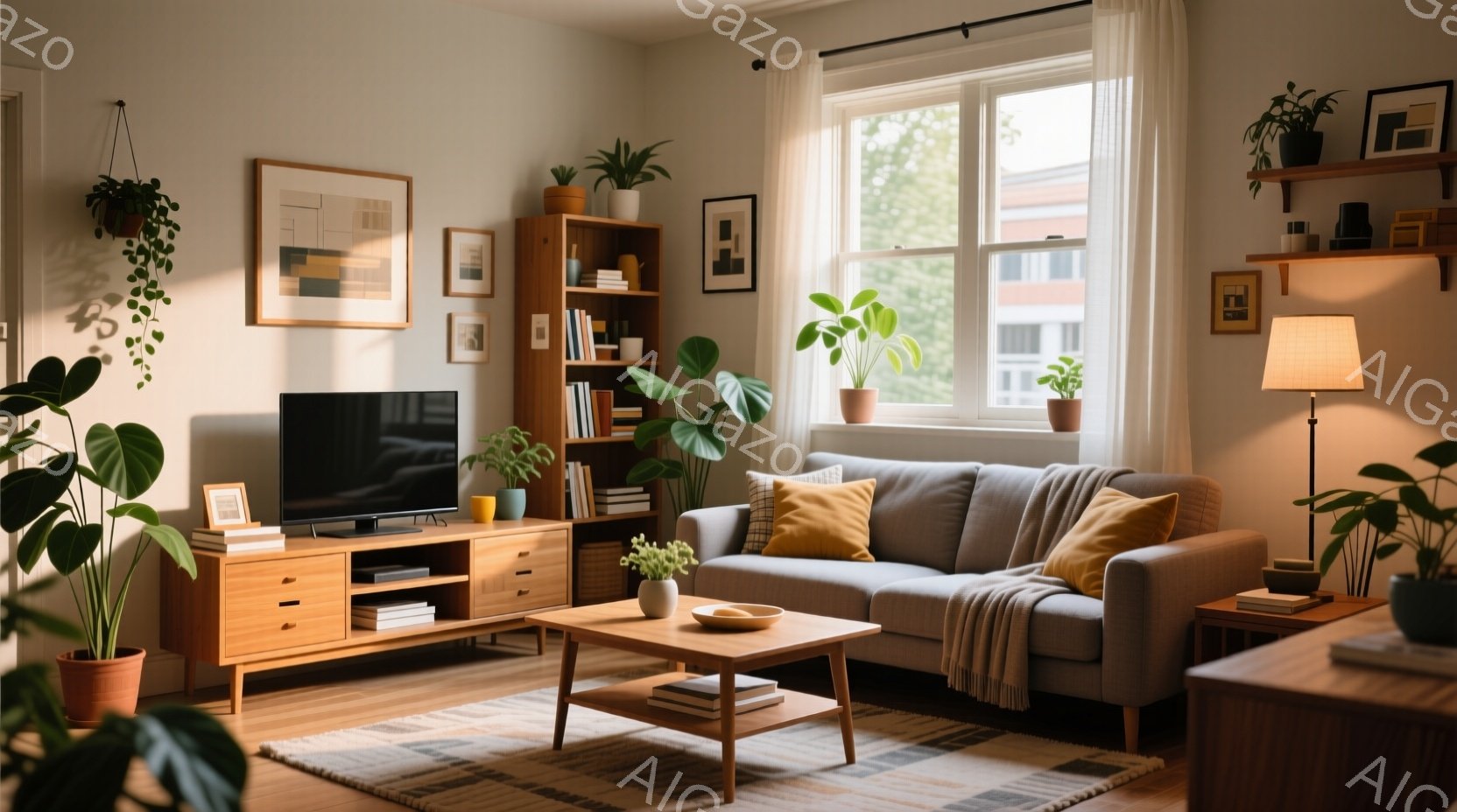 明るいリビングルームで、グレーのソファが2つ並べられています。壁には抽象的な絵画が飾られ、棚には観葉植物や本が置かれています。窓からは自然光が差し込み、温かく穏やかな雰囲気を醸し出しています。