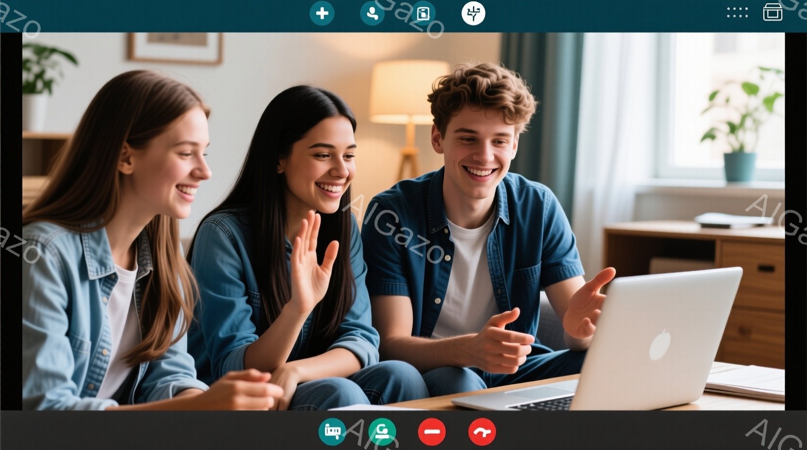 ソファに座った若い女性二名と男性一名が、開いたノートパソコンの画面を見ながらビデオ通話を楽しんでいる様子が写っている。女性はそれぞれ黄色と赤のトップスを着ており、男性は濃い青色のシャツを着ている。全員が笑顔で、女性の一人は手を振り、もう一人は親指を立てており、活気があり温かい雰囲気が感じられる。