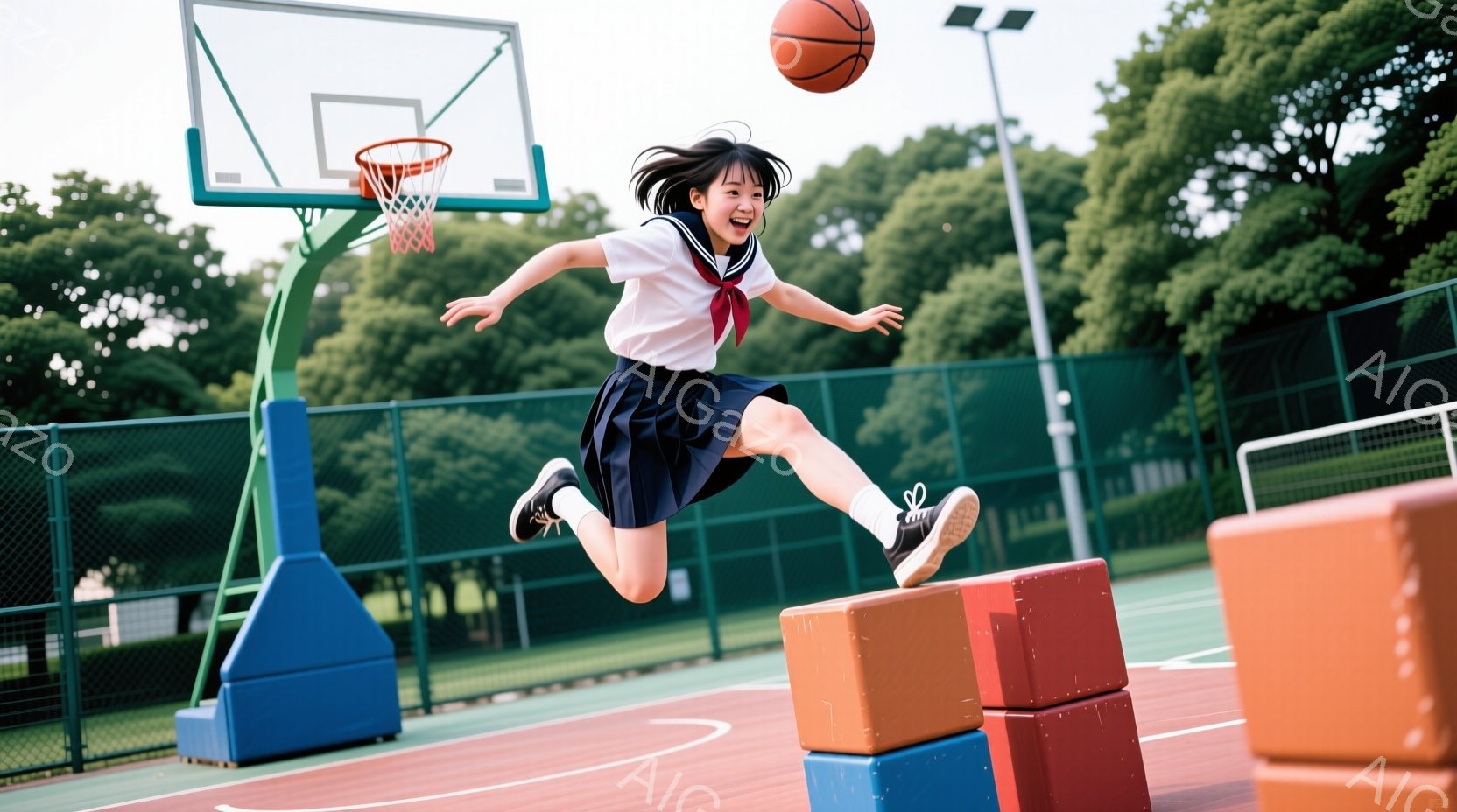 明るい青空の下、制服姿の少女がバスケットボールを持ってジャンプしている。彼女は白いシャツに紺色のスカート、そして髪を肩まで伸ばしたヘアスタイルで、満面の笑みを浮かべている。背景にはバスケットゴールと色とりどりの積み重ねられたブロックがあり、活気に満ちた屋外の雰囲気が漂っている。