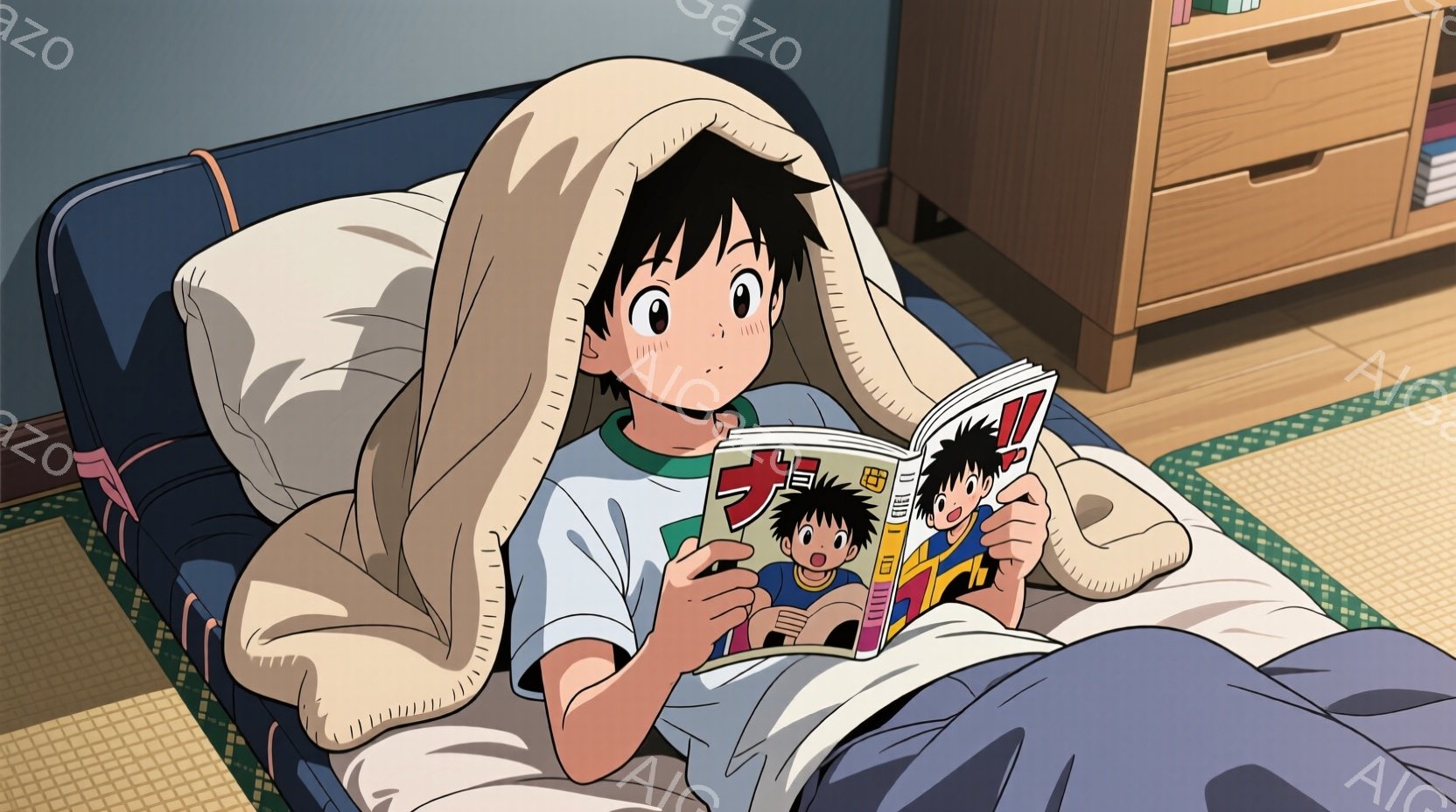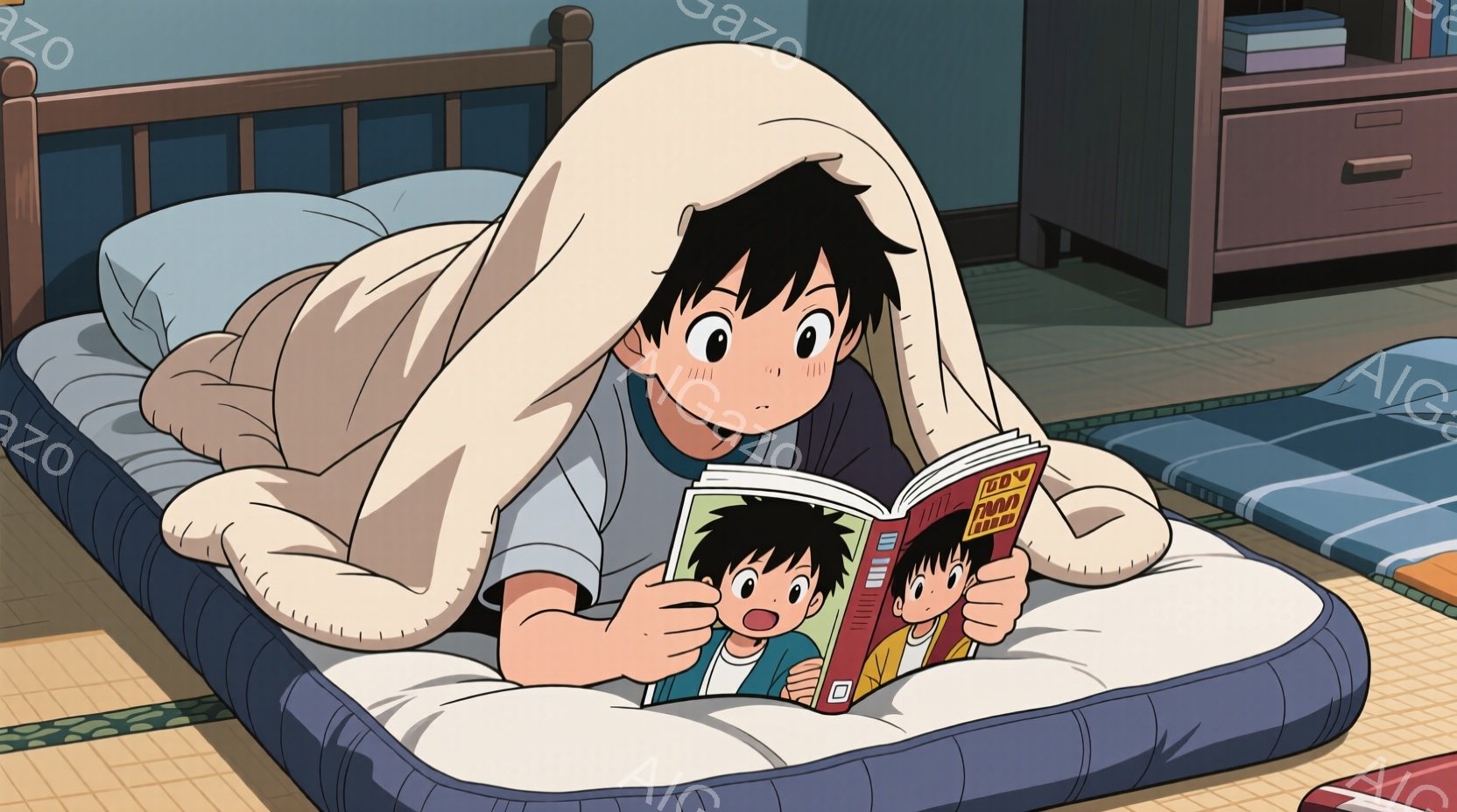 男の子はベッドに横たわり、毛布にくるまって本を読んでいます。彼は茶色の髪で、真剣な表情で本に集中しており、赤いシャツと短パンを着ています。背景には本棚やベッドサイドテーブルがあり、部屋は落ち着いた雰囲気で、読書に最適な環境を示唆しています。