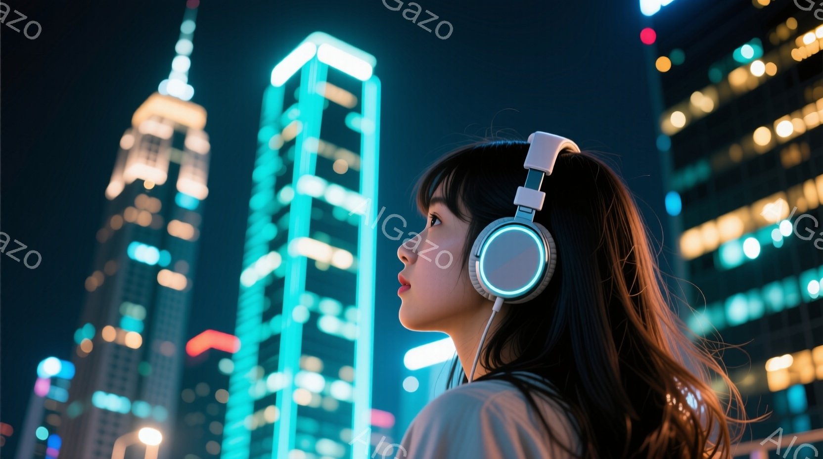 長い黒髪の女性がヘッドホンをつけて夜景を見つめている。彼女は肩から見える赤い服を着ており、横顔は穏やかで少し憂いを帯びている。背景には、ネオンライトで輝く高層ビル群が広がり、都市の夜の喧騒と静寂が混ざり合った雰囲気を醸し出している。