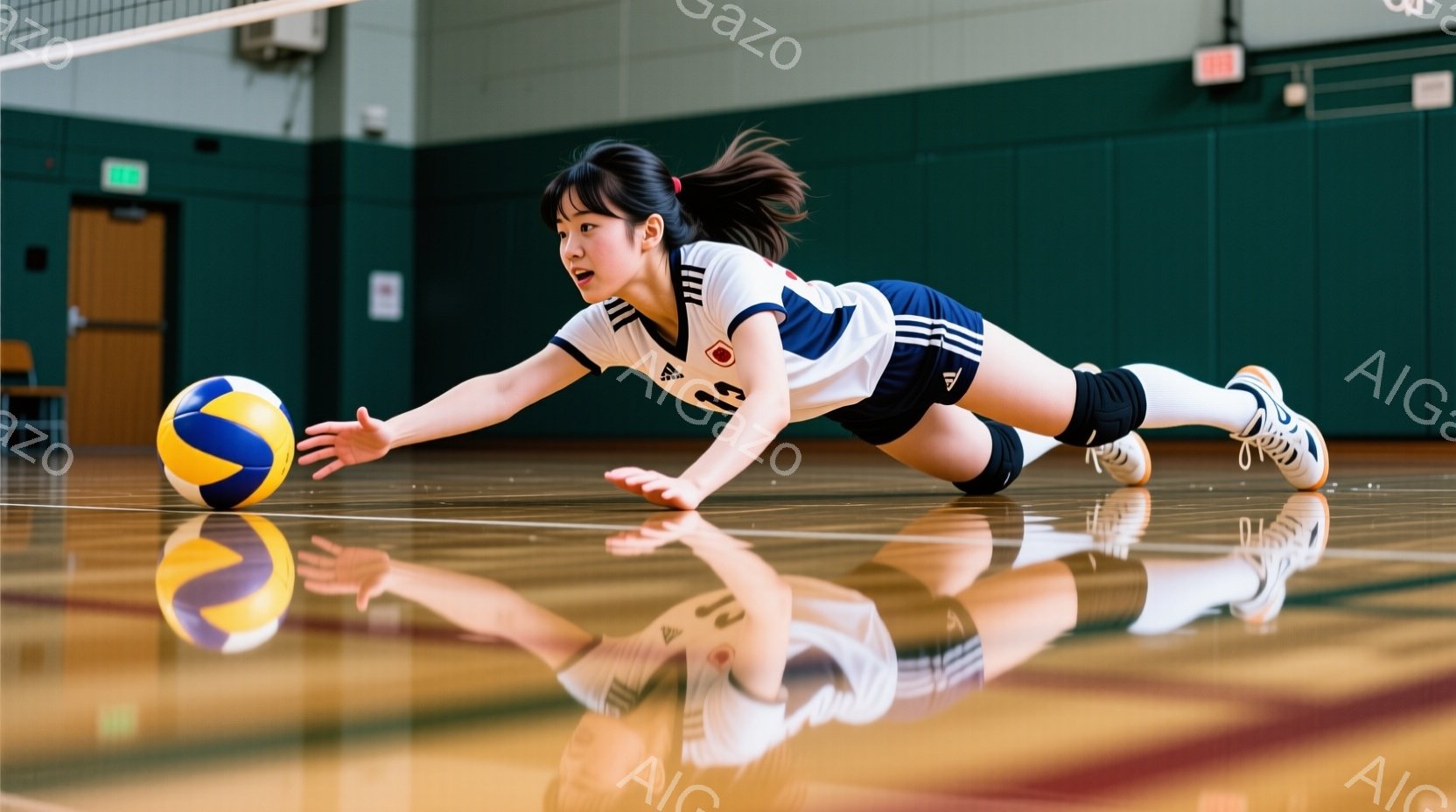 バレーボールの選手が床に体を投げ出し、ボールに手を伸ばしている様子が写っている。彼女は白い長袖のユニフォームに青いラインが入っており、髪はポニーテールに結ばれている。床は光沢があり、背景にはぼやけた体育館の壁が見える。