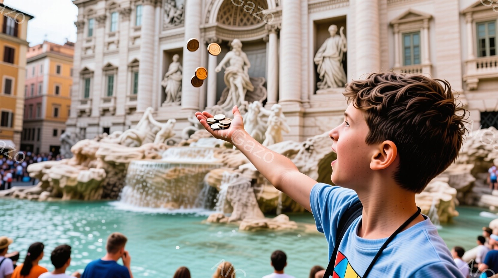 少年は青いTシャツを着て、トレヴィの泉にコインを投げ入れています。彼の髪は短く、背中が見えることから、多くの人がいる賑やかな場所であることがわかります。背景には壮大なバロック様式の建造物と、青々とした水が流れ落ちる泉があり、明るい日差しが差し込み、観光客で賑わっている様子が伝わってきます。
