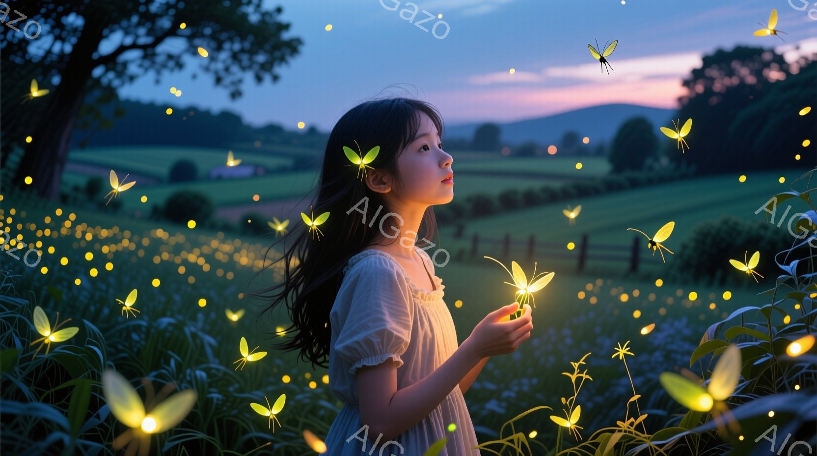 長い髪を背中に垂らし、白いワンピースを着た少女が、たくさんの光る虫(蛍)に囲まれています。彼女は手を前に出し、何かの光るものを握っており、少し下を見つめています。背景には緑豊かな草原と木々、そして遠くにぼんやりとしたフェンスが見え、夕暮れ時の穏やかで幻想的な雰囲気が漂っています。