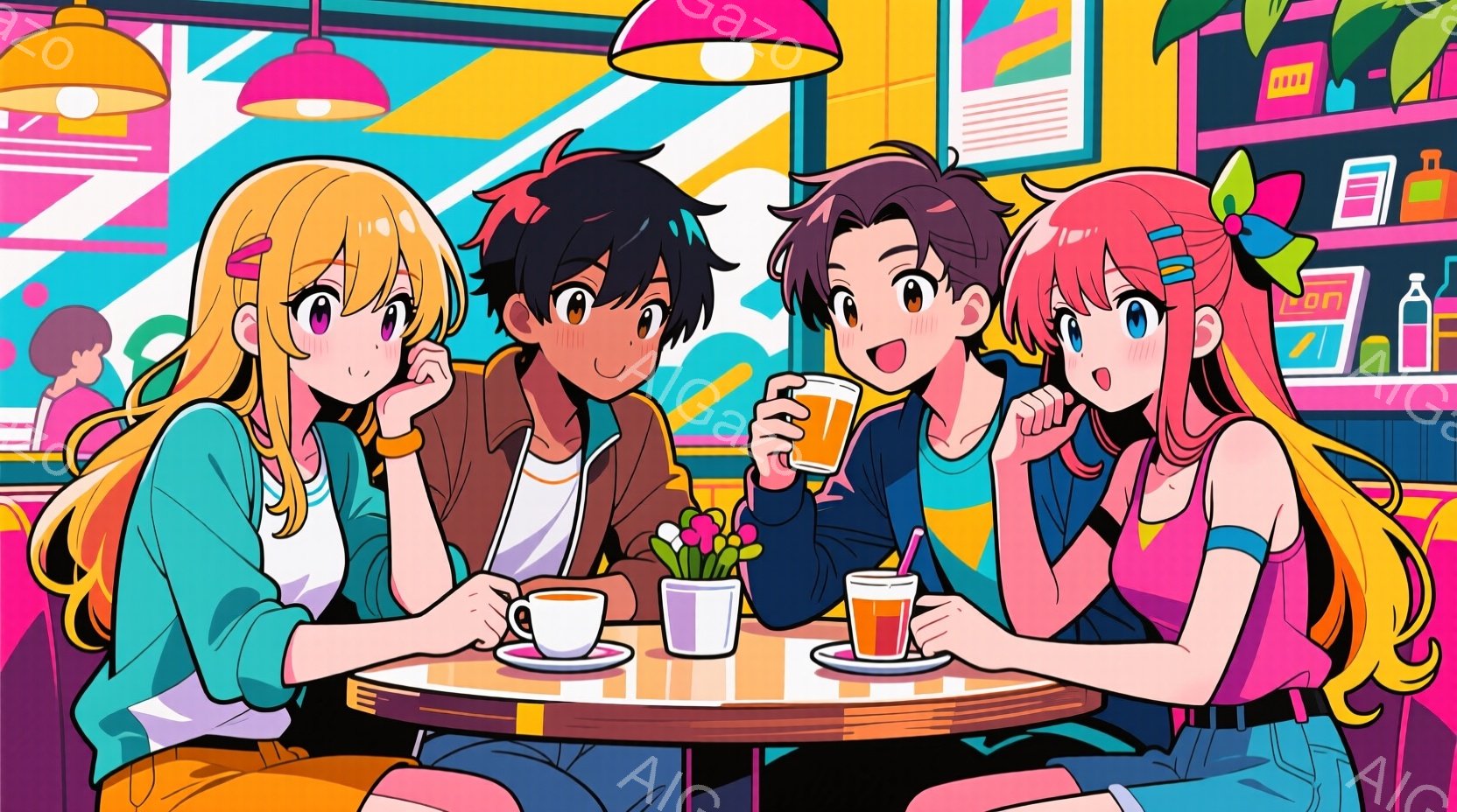 鮮やかな色彩で描かれたカフェの内部で、三人の若い男女がテーブルを囲んで座っています。女性はそれぞれ明るい色のトップスとスカートを身につけ、特徴的な髪型と笑顔を見せています。背景にはレトロな雰囲気の装飾やカウンター、そしてカラフルな照明が配置され、活気のあるカフェの雰囲気を醸し出しています。