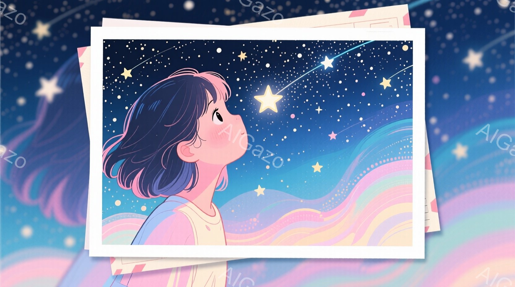 暗い夜空を背景に、黒髪の少女が上を見ている。彼女は白いシャツを着ており、少し頬を赤らめている。背景には、様々な大きさの星や、淡いピンクと水色の雲のような模様が広がり、幻想的な雰囲気を醸し出している。