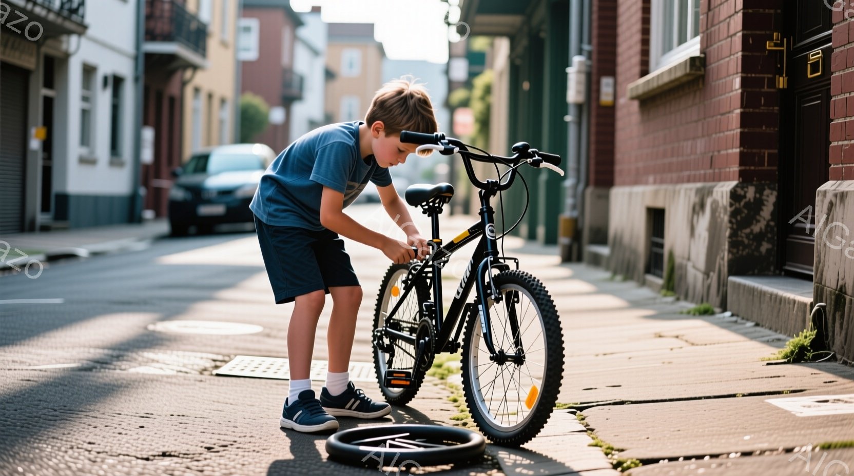 若い少年が道路の真ん中で自転車の修理をしている様子が写っている。彼は濃い青色のTシャツと黒い短パン、そして白いスニーカーを履いており、少し無表情で集中した様子で自転車のペダル付近を見ている。背景にはレンガ造りの建物が並び、日差しが強く、全体的に静かで平和な雰囲気が漂っている。
