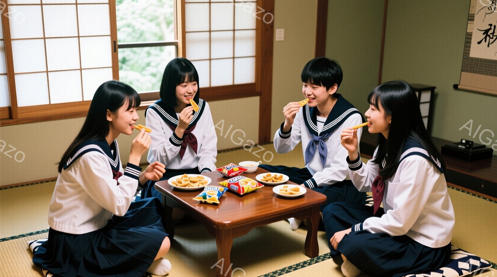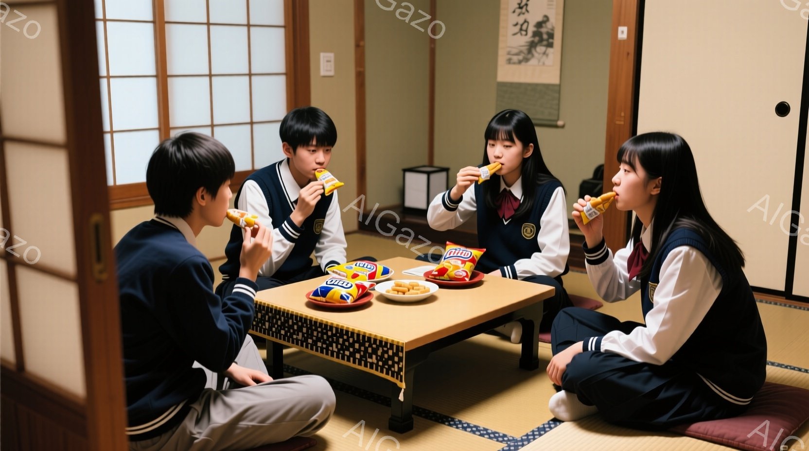 畳の部屋に座ってスナック菓子を囲む高校生たちのグループが描かれている。制服を着た生徒たちは、それぞれ異なる種類のポテトチップスを持ち、リラックスした表情で談笑しているようだ。背景には掛け軸と低いテーブル、そして伝統的な日本の部屋の雰囲気が感じられる。