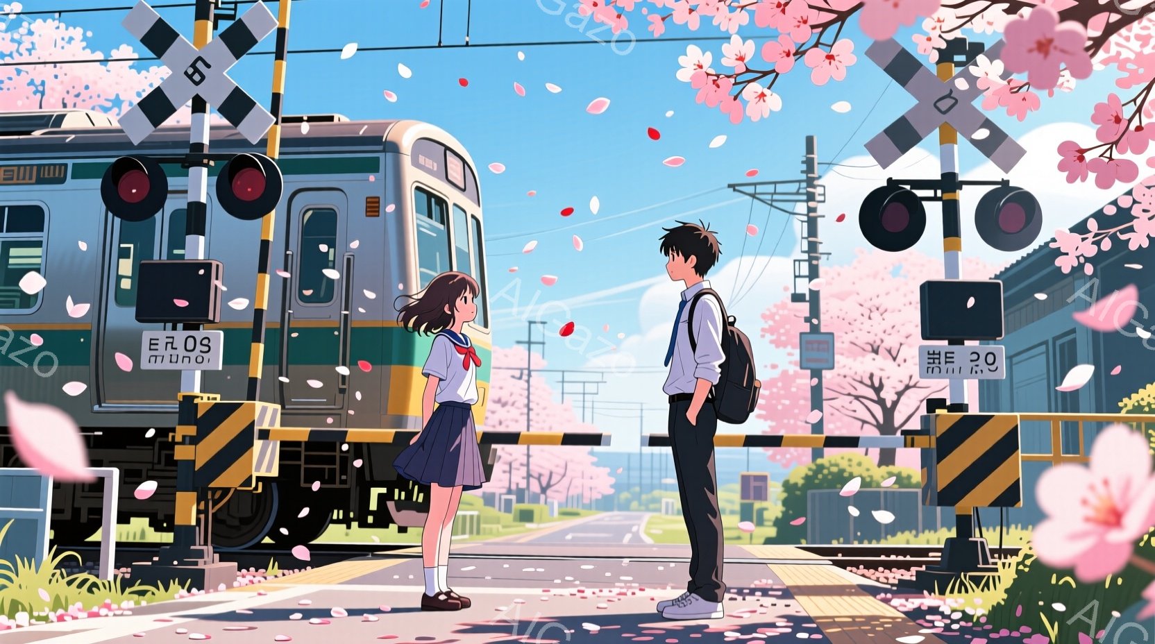 制服を着た女子高生とスーツ姿の男子が線路沿いの踏切で向かい合っている。桜の花びらが舞い散り、背景には電車が停車しているのが見える。二人は少し顔を上げ、互いの視線を捉え、春の暖かく、少し切ない雰囲気を醸し出している。