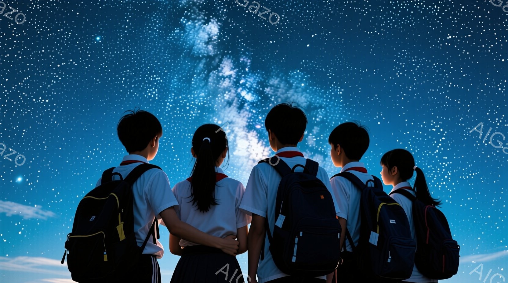 紺色の背景に、肩を組んだ4人の学生が写っている。彼らは皆、白いシャツと紺色のブレザーを着ており、黒いリュックサックを背負っている。背景には星空が広がり、夢見がちな雰囲気を醸し出している。
