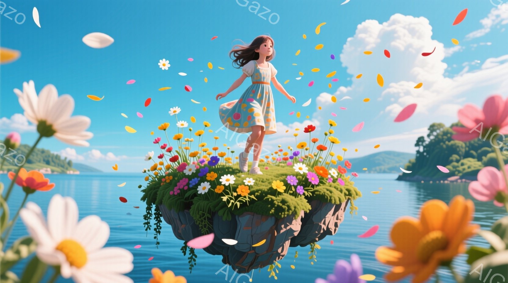 空中に浮かぶ緑豊かな島の上に、花柄のワンピースを着た女性が立っている。彼女は髪をなびかせ、嬉しそうな表情で両手を広げ、まるで踊っているかのようだ。背景には穏やかな青い海と緑の丘が広がり、空には白い雲が浮かび、幻想的で平和な雰囲気を醸し出している。