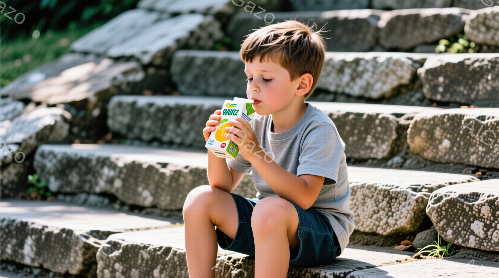 茶色の髪の少年が、石段に座ってオレンジジュースを飲んでいます。少年は白いTシャツと紺色の短パンを着ており、少しうつむき加減でジュースに集中した表情をしています。背景には、緑の草が生い茂り、石段が続いているのが見え、晴れた日の穏やかな雰囲気が漂っています。