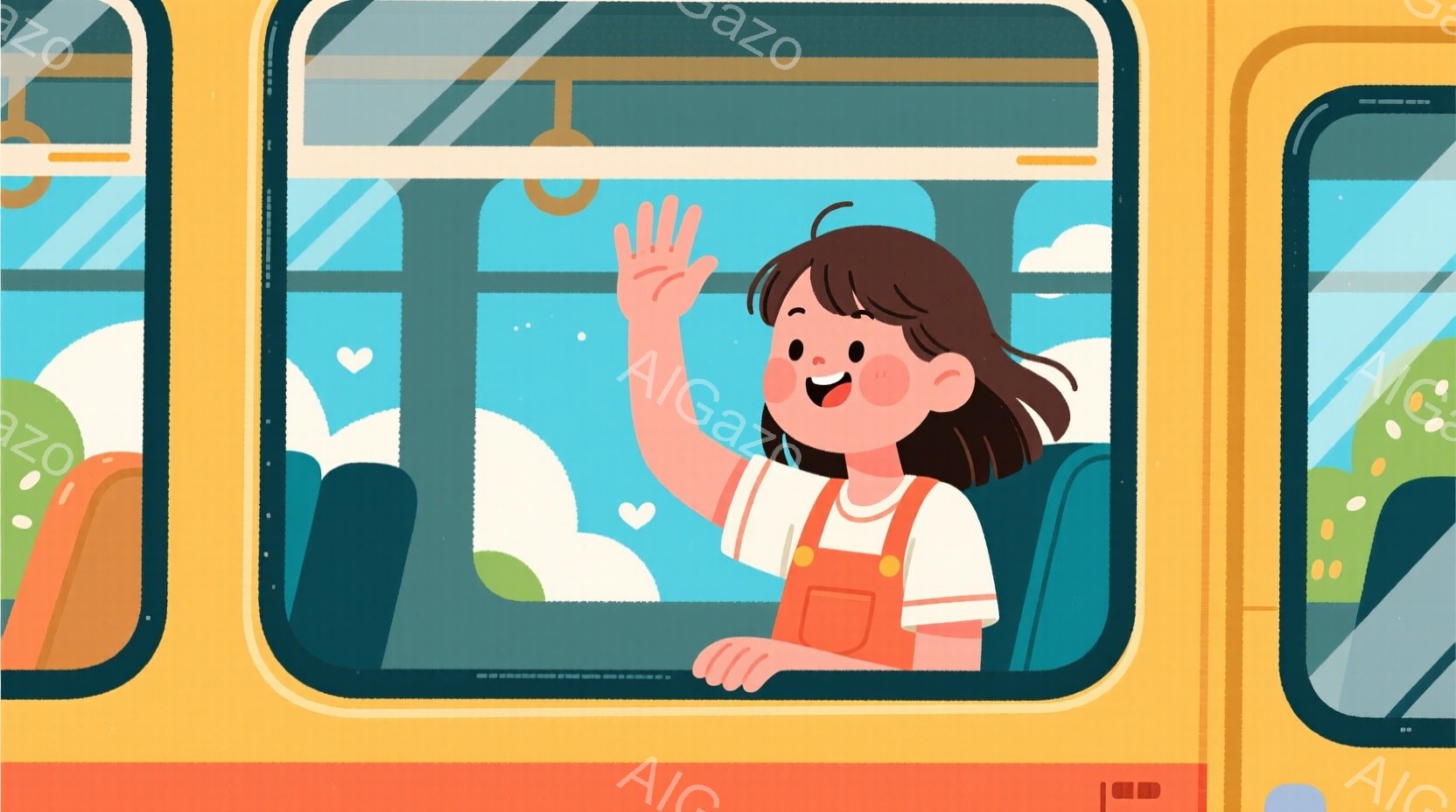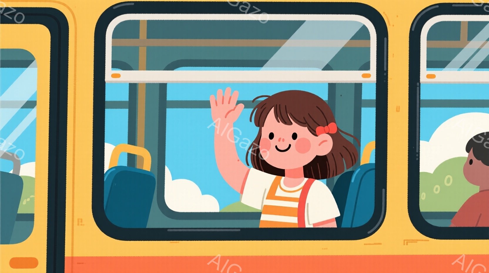 茶髪の少女がバスの窓から手を振っています。白いTシャツにオレンジ色のオーバーオール姿で、笑顔が印象的です。窓の外には青い空と緑色の大きな荷物が見え、明るく楽しい雰囲気が漂っています。