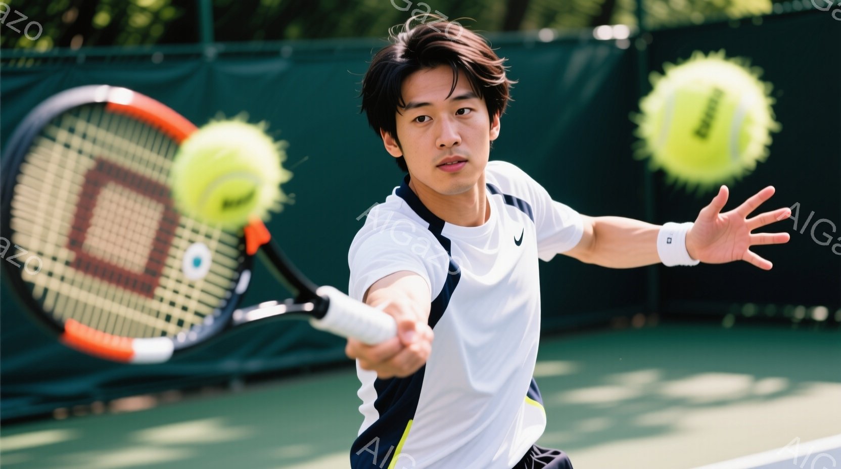 この無料AI生成画像「若い男性がテニスラケットを振りかぶり、フォアハンドストロークを打とうとしている瞬間を捉えた写真です。彼は白いテニスウェアと手首に白いリストバンドを着用し、短髪で、真剣な表情をしています。背景には緑のテニスコートとネットが見え、晴天で明るい雰囲気です。」は、2025年10月22日に作成されました。 サイズは 1664×928px の高解像度で、商用利用も可能なフリー素材として提供しています。