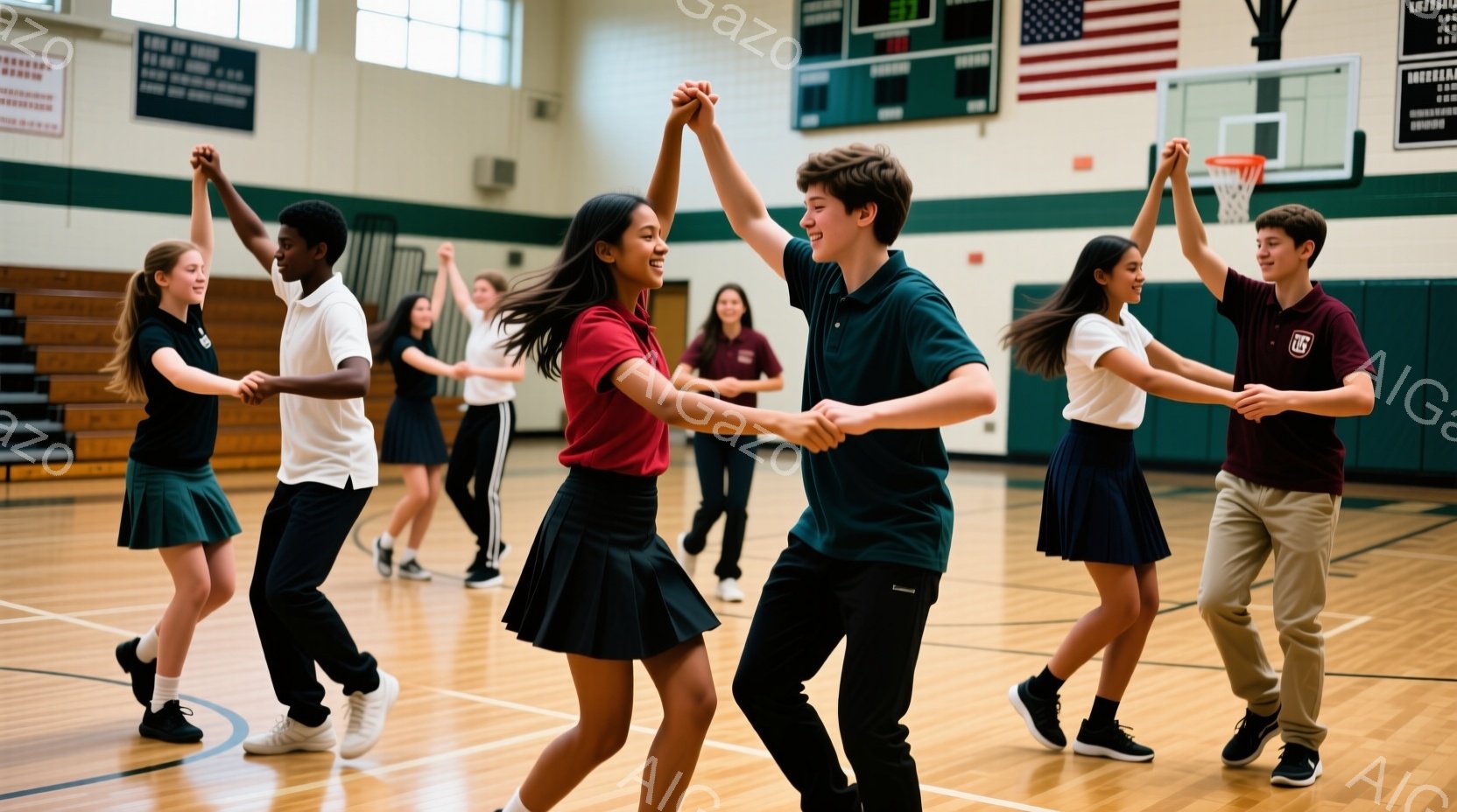 体育館で若い男女がペアになって踊っている様子が写っている。女性は黒いタンクトップとフレアスカートを着ており、長い髪が踊る動きに合わせて揺れている。男性はターコイズブルーのTシャツと黒いズボンを着用し、皆、笑顔で楽しそうに踊っている。