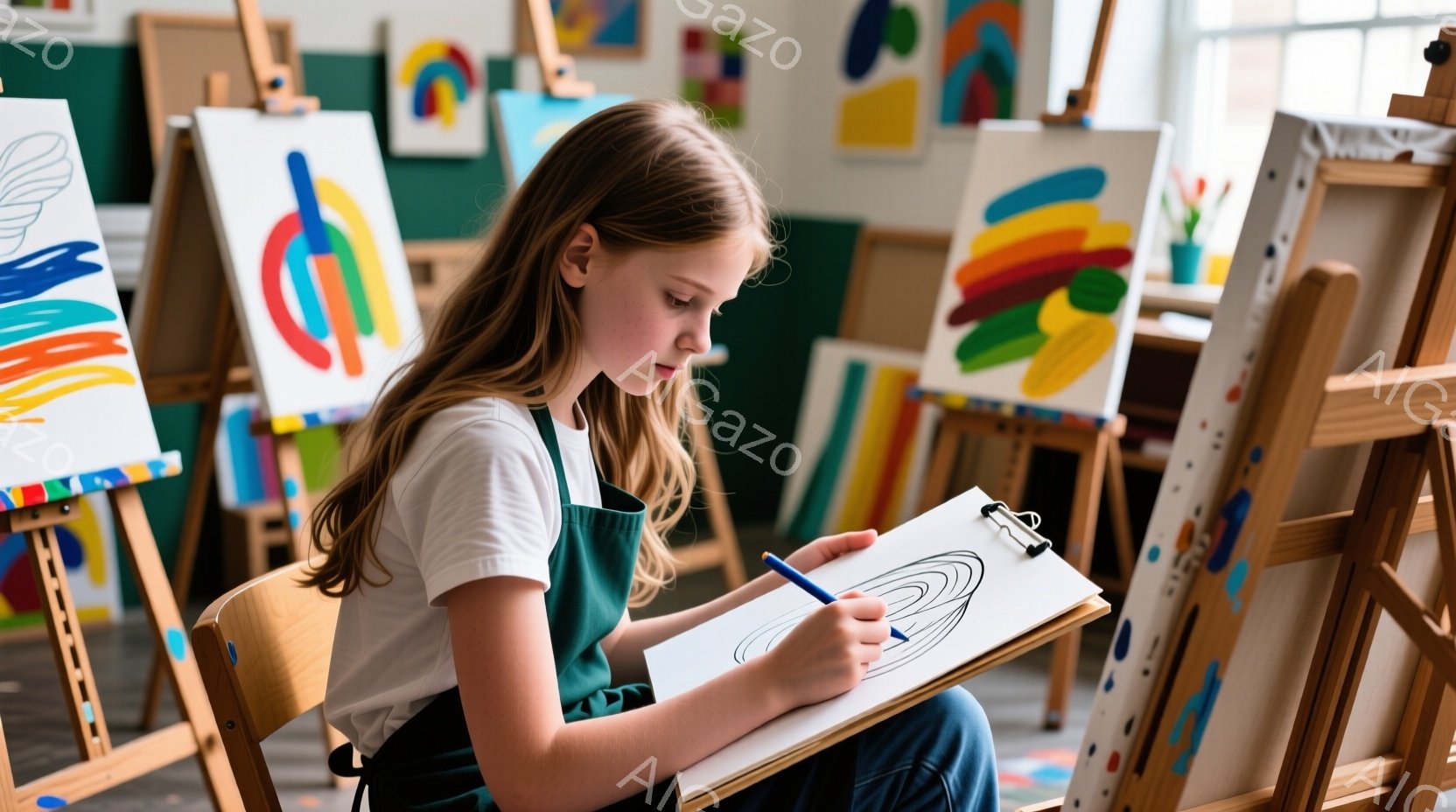 若い女の子が、膝の上にスケッチブックを置き、青い鉛筆で絵を描いています。彼女はデニムのオーバーオールと白いTシャツを着ており、長く明るい茶色の髪は肩にかかっています。背景には色とりどりの絵画がイーゼルに立てかけられており、アトリエのような雰囲気で、創造的で集中した空気感があります。