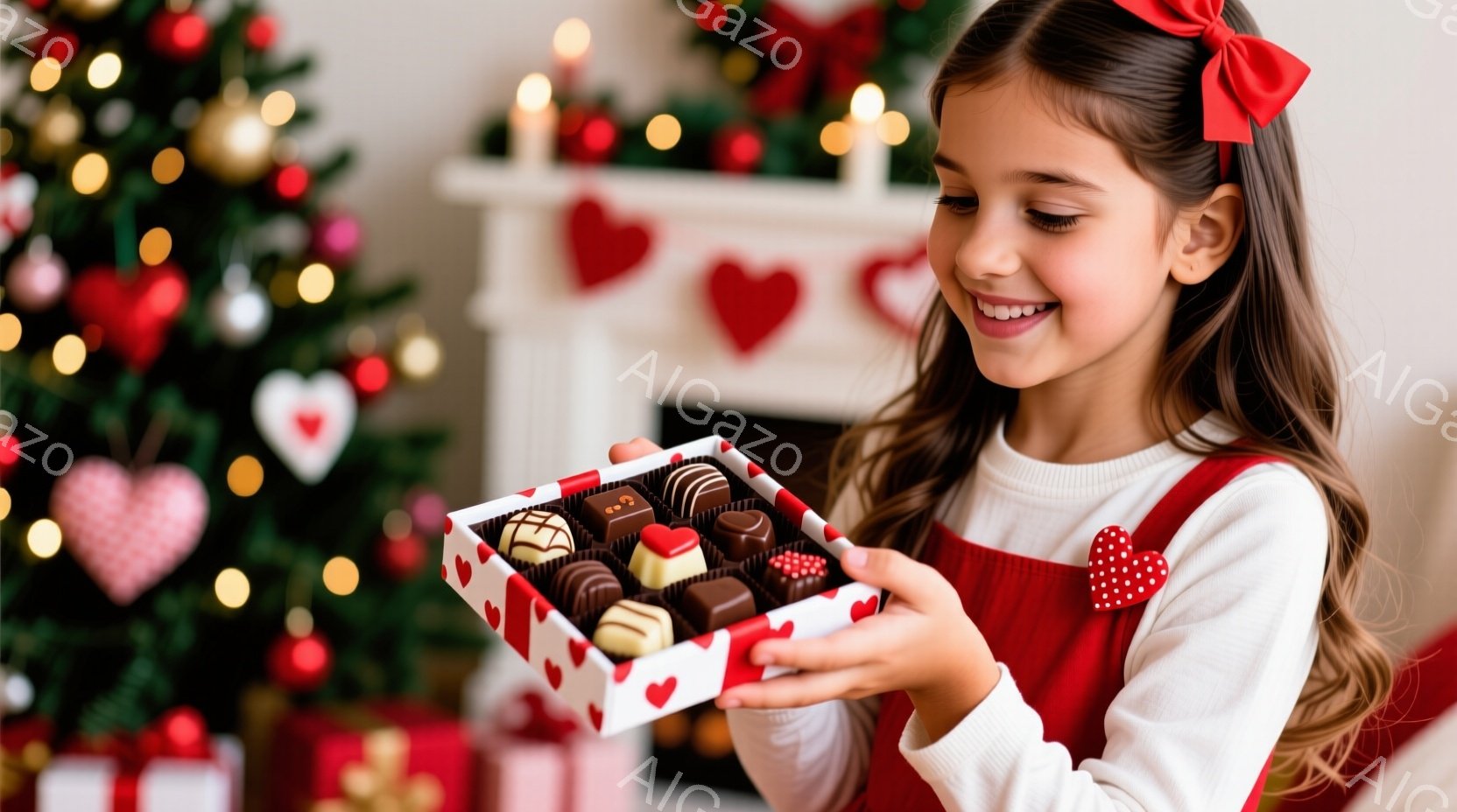 小さな女の子が赤いセーターを着て、髪には赤いリボンをつけて笑顔でプレゼントを受け取っています。プレゼントは赤い包装紙で包まれ、チョコレートでいっぱいです。背景にはクリスマスツリーや暖炉が見え、温かくお祝いムードに満ちています。