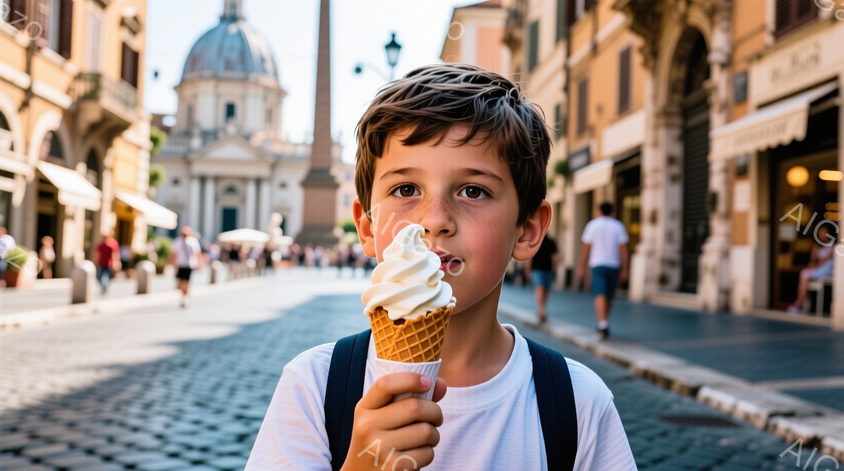 少年はアイスクリームを手に、満面の笑みを浮かべている。白いTシャツと黒いバックパックを身につけ、太陽の下で楽しんでいる様子が伺える。背景には石畳の道と歴史的な建物が広がり、晴れた空の下、活気のある街並みが広がっている。