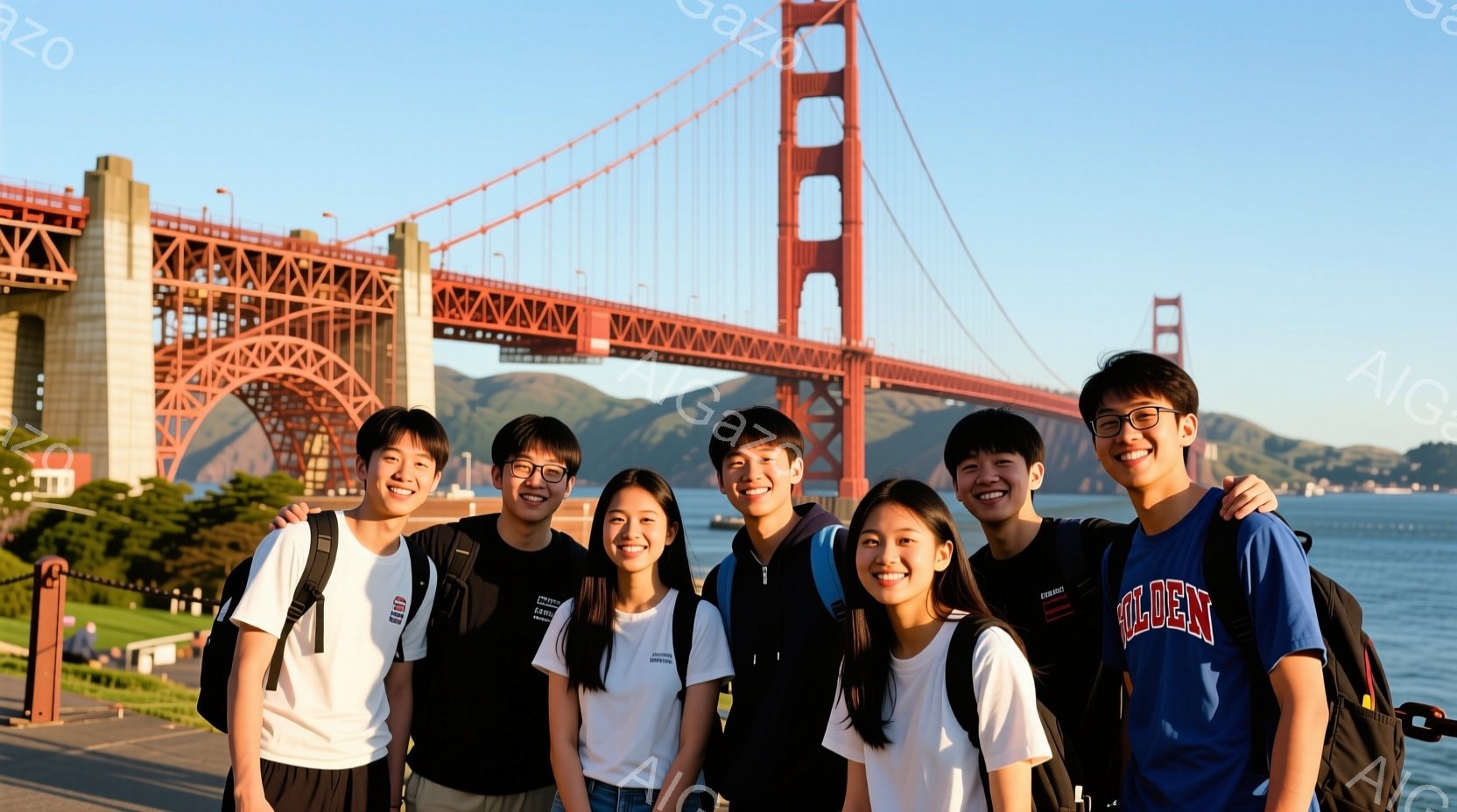 6人の若者が金門橋を背景に肩を組んで笑顔で写っています。彼らは皆、カジュアルな服装で、デニムジーンズにジージャンやパーカーを着ています。晴れた空と穏やかな海、そして夕暮れ時の柔らかな光が、温かく親しげな雰囲気を醸し出しています。