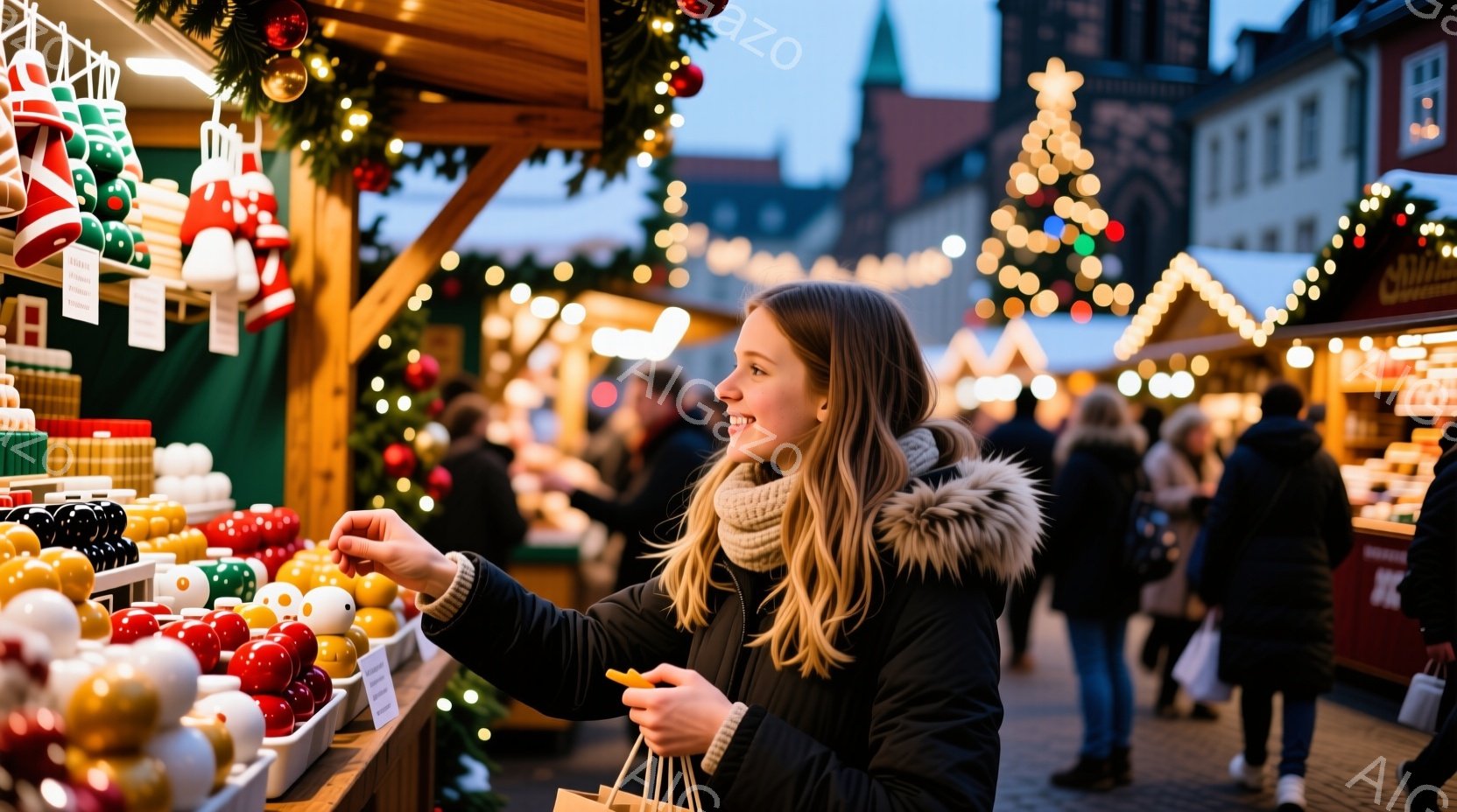 クリスマスマーケットで、赤いニット帽をかぶり、黒い冬用ジャケットを着た若い女性がスマートフォンを見つめています。彼女はショッピングバッグを持っており、笑顔で楽しそうに買い物をしています。背景には、クリスマスオーナメントで飾られた屋台や、遠くに見える建物があり、暖かい光に包まれた華やかな雰囲気です。