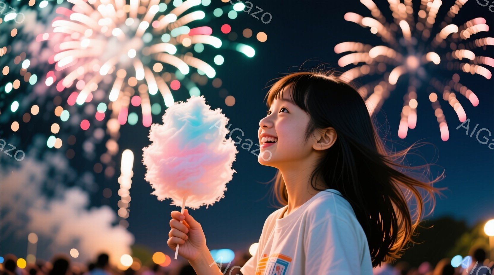 少女は綿あめを片手に、夜空を見上げて楽しそうに笑っている。彼女は白いTシャツを着ており、髪は肩まで伸びて少しカールしている。背景には花火が打ち上げられ、夜空を明るく照らし、お祭りの賑やかな雰囲気が伝わってくる。