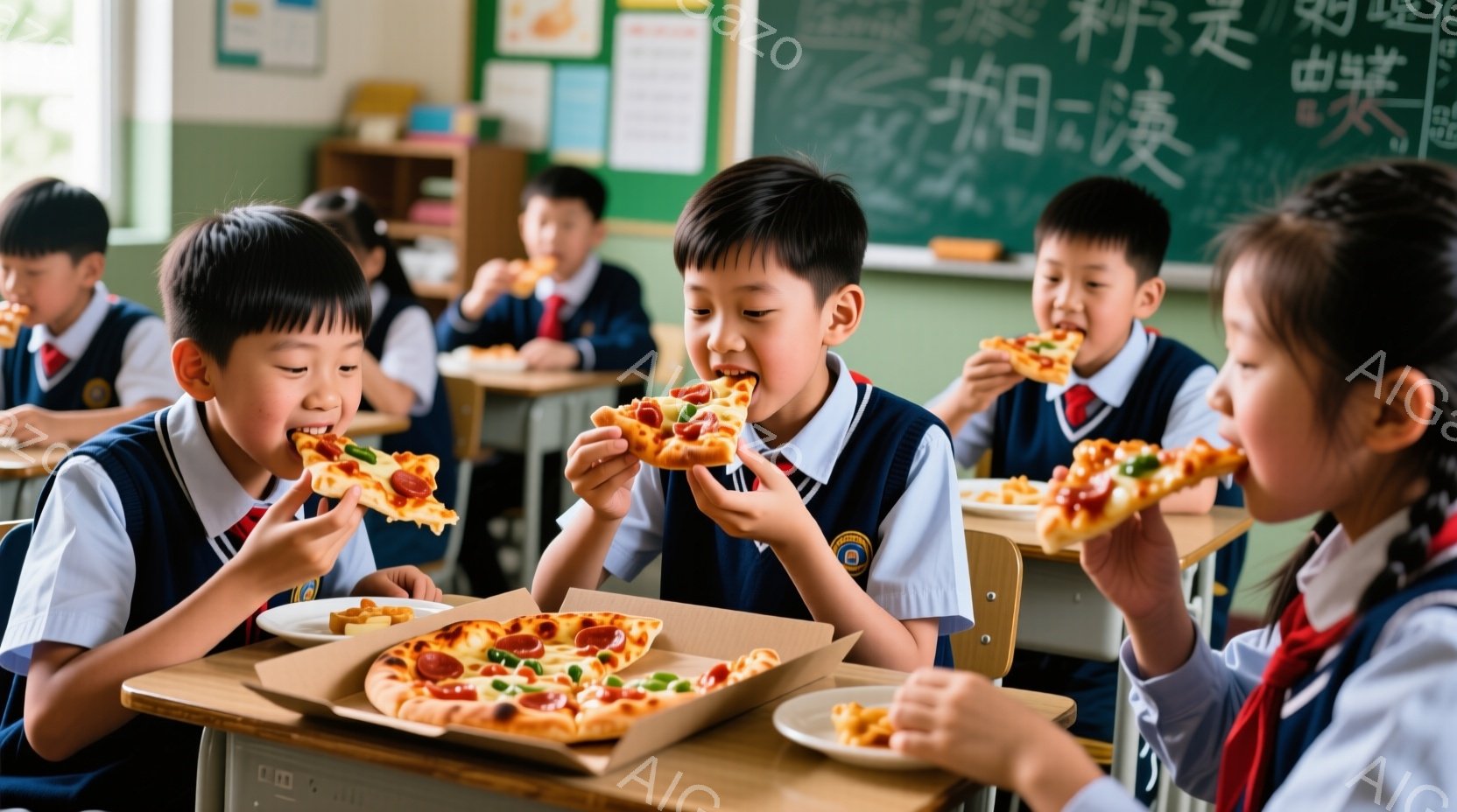 制服を着た小学生たちが教室でピザを食べている様子が写っている。子供たちは皆、青いブレザー、白いシャツ、赤いネクタイを着用し、前髪を整えた髪型をしている。教室には木製の机と椅子があり、背景には黒板が見える、明るく楽しい雰囲気の画像である。