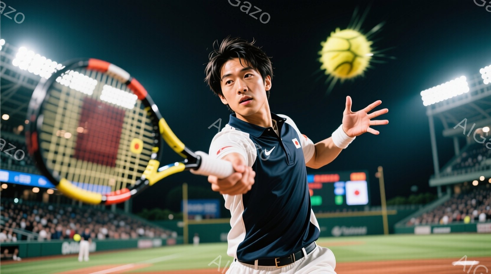 この無料AI生成画像「黒いシャツと白いショートパンツを着用した若い男性テニス選手が、テニスボールを打ち返す瞬間を捉えた写真です。彼は力強いフォームでラケットを振り抜き、集中した表情を浮かべています。背景には、夜間のテニスコートと観客席が見え、競技場の照明が明るく照らしています。」は、2025年10月22日に作成されました。 サイズは 1664×928px の高解像度で、商用利用も可能なフリー素材として提供しています。