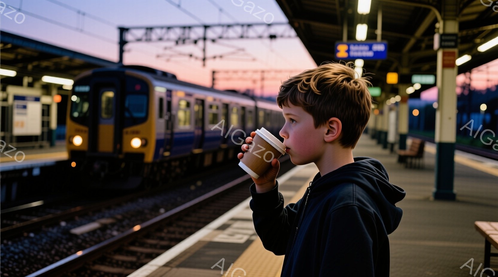 少年は駅のプラットフォームで紙コップを持って何かを飲んでいます。彼は濃い青のパーカーを着ており、明るい茶色のカールした髪を持っています。背景には電車が停車しており、夕焼け空が広がって、少し寂しげで穏やかな雰囲気を作り出しています。