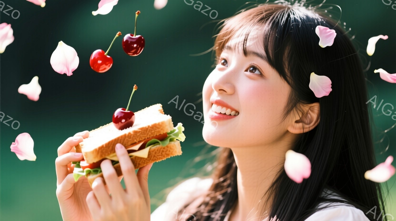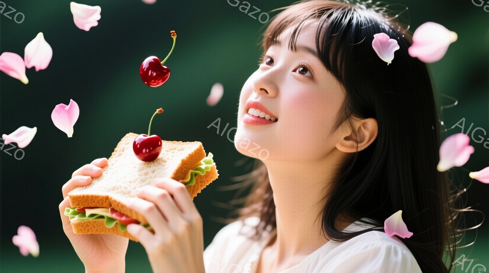 黒髪の女性がサンドイッチを持っている写真です。彼女は白いトップスを着ており、少し上目遣いで微笑んでいます。背景にはピンク色の花びらが舞い、明るく暖かい春の雰囲気が漂っています。