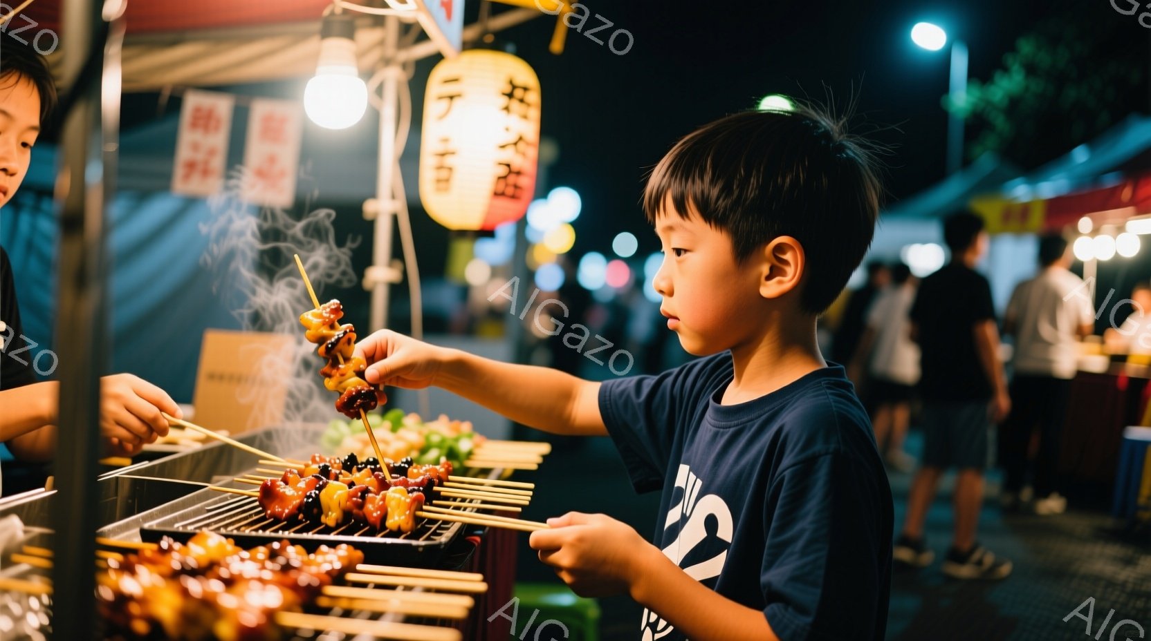 制服を着た学生たちが、たい焼きを美味しそうに食べている様子が写っている。彼らは皆、短い髪で、少し笑顔を見せながら、たい焼きにかぶりついている。背景には、夜の街並みと、いくつかの飲食店が見え、活気のある雰囲気を感じさせる。