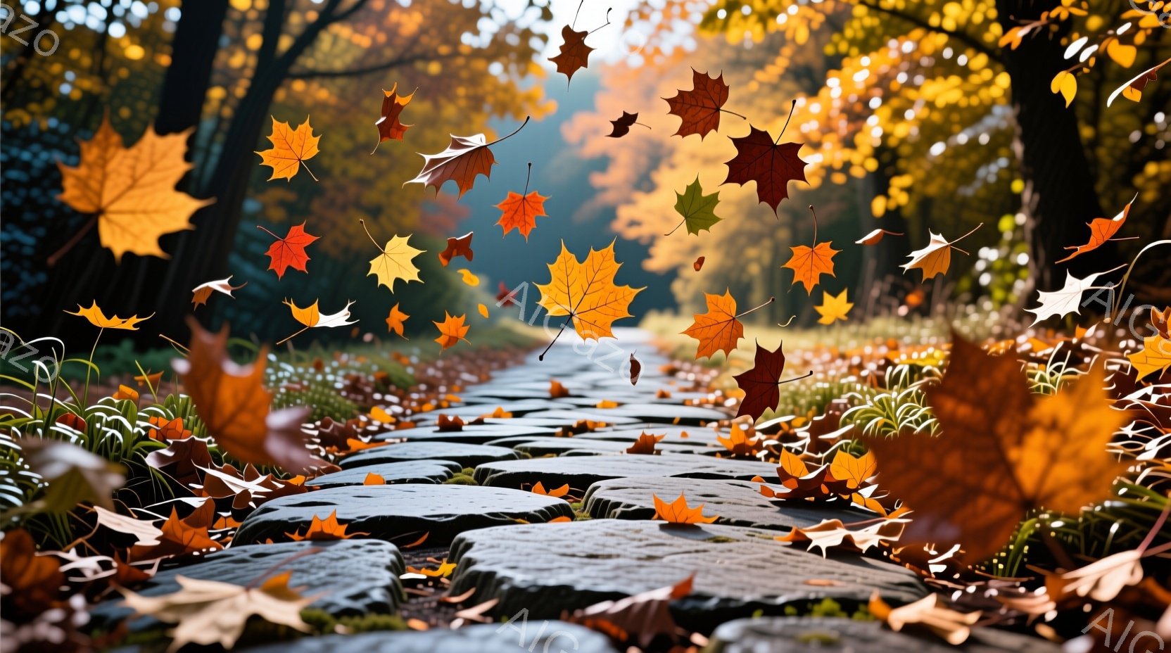 苔むした石畳の道に、赤や黄色の落ち葉が舞い散り、秋の風景が広がっている。背景には木々が生い茂り、柔らかい光が差し込み、温かみのある雰囲気を醸し出している。落ち葉と石畳のコントラストが、静寂さと季節の移ろいを感じさせる美しい情景である。