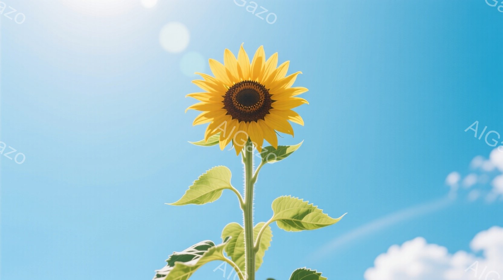 鮮やかな青空を背景に、ひまわりのみが大きく写っている写真です。ひまわりは茎を高く伸ばし、緑の葉を広げ、太陽に向かって咲き誇っています。空にはわずかな雲と光のフレアがあり、夏らしい明るく爽やかな雰囲気を醸し出しています。
