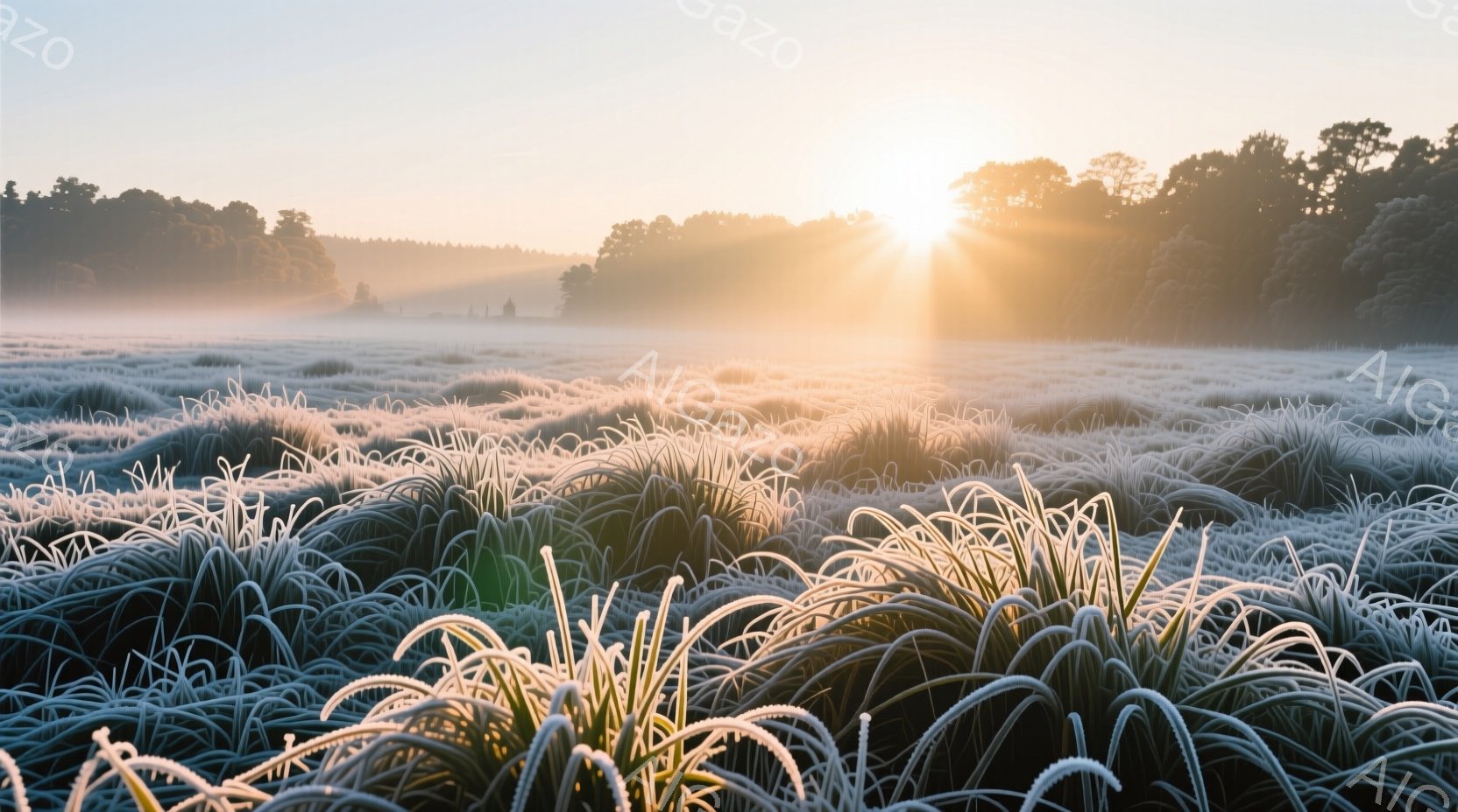 広大な草原が霜で覆われ、まるで銀色の波のようになっている。遠くには木々がぼんやりと見え、朝日が草原を黄金色に染め上げ、幻想的な雰囲気を醸し出している。この風景は静寂と美しさに満ちており、自然の力強さと繊細さを感じさせる。