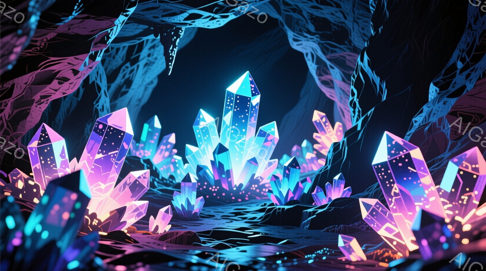 光り輝く青緑色の結晶が密集した洞窟内部を描いています。結晶は不規則な形をしており、まるで生命力に満ち溢れているかのようです。背景には、複雑な線で描かれた暗い岩肌が広がり、神秘的で幻想的な雰囲気を醸し出しています。