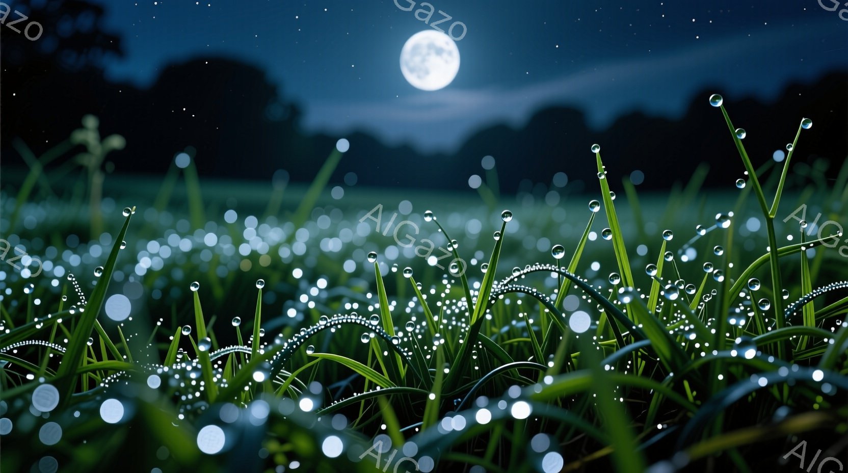 夜の草原が描かれており、草の葉には朝露のような水滴が光っている。背景には暗いシルエットの木々と満月が輝き、静かで幻想的な雰囲気を醸し出している。水滴はまるで小さな宝石のように輝き、草の緑と夜空の青とのコントラストが美しい。