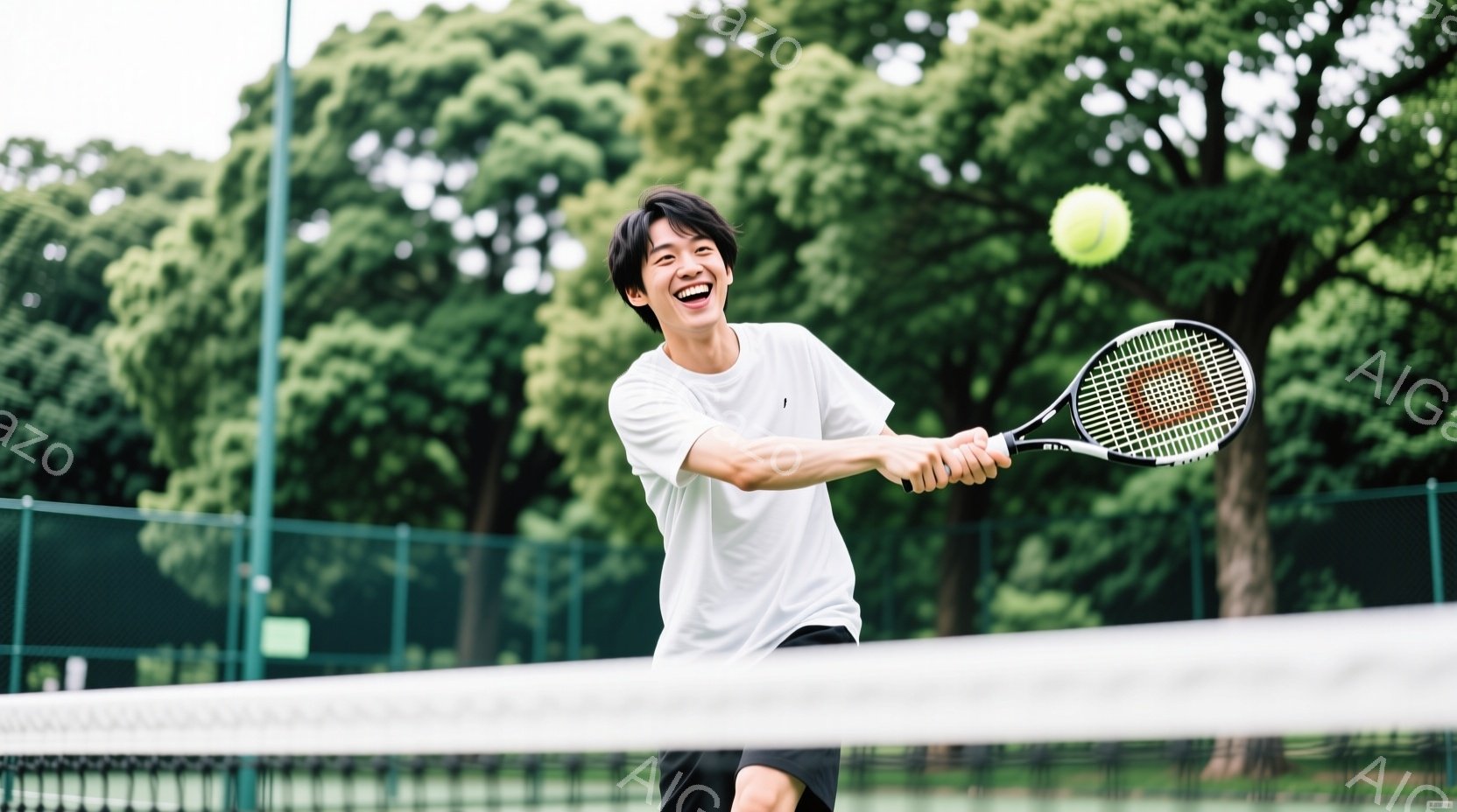 若い男性テニス選手が、ネットを越えてボールを打とうとしている瞬間を捉えた写真です。彼は、白と水色のストライプのシャツと黒いショーツを着用し、短髪で、満面の笑みを浮かべています。背景には緑豊かな木々とテニスコートの緑の芝生があり、晴天の屋外でスポーツを楽しむ様子が伝わってきます。