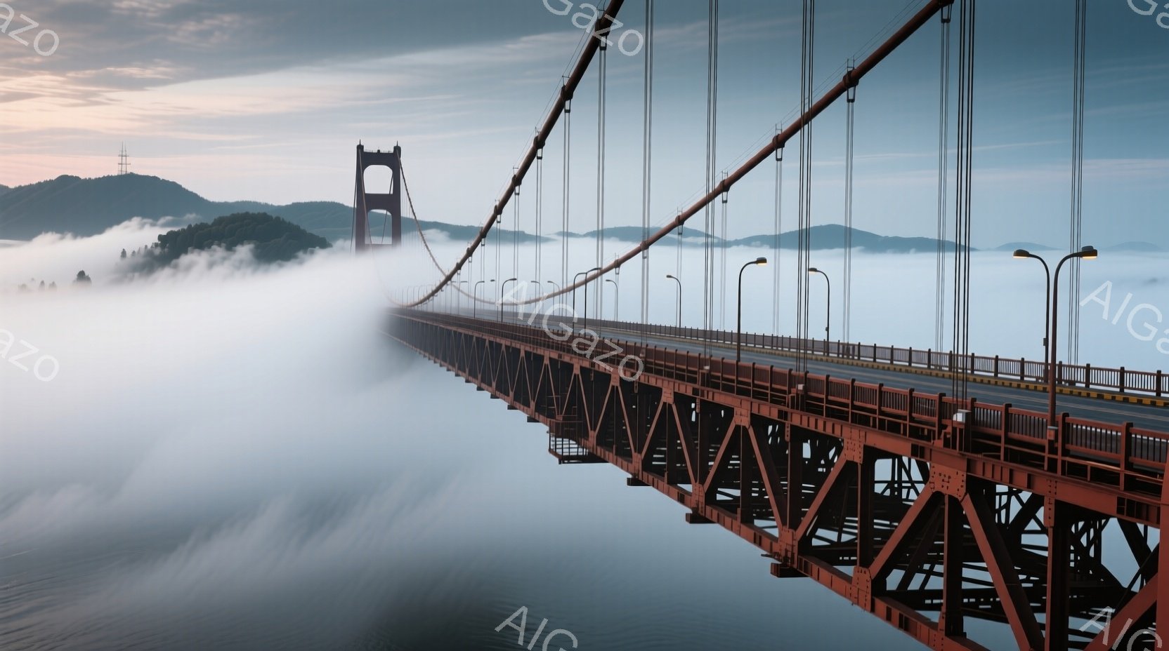 巨大な吊り橋が霧に包まれた水面の上を長く伸びています。橋の構造は青灰色で、頑丈な鉄骨が組み合わさり、霧の中に消えるように遠くへ続いています。背景には霧に覆われた山々がそびえ立ち、静かで神秘的な雰囲気を醸し出しています。