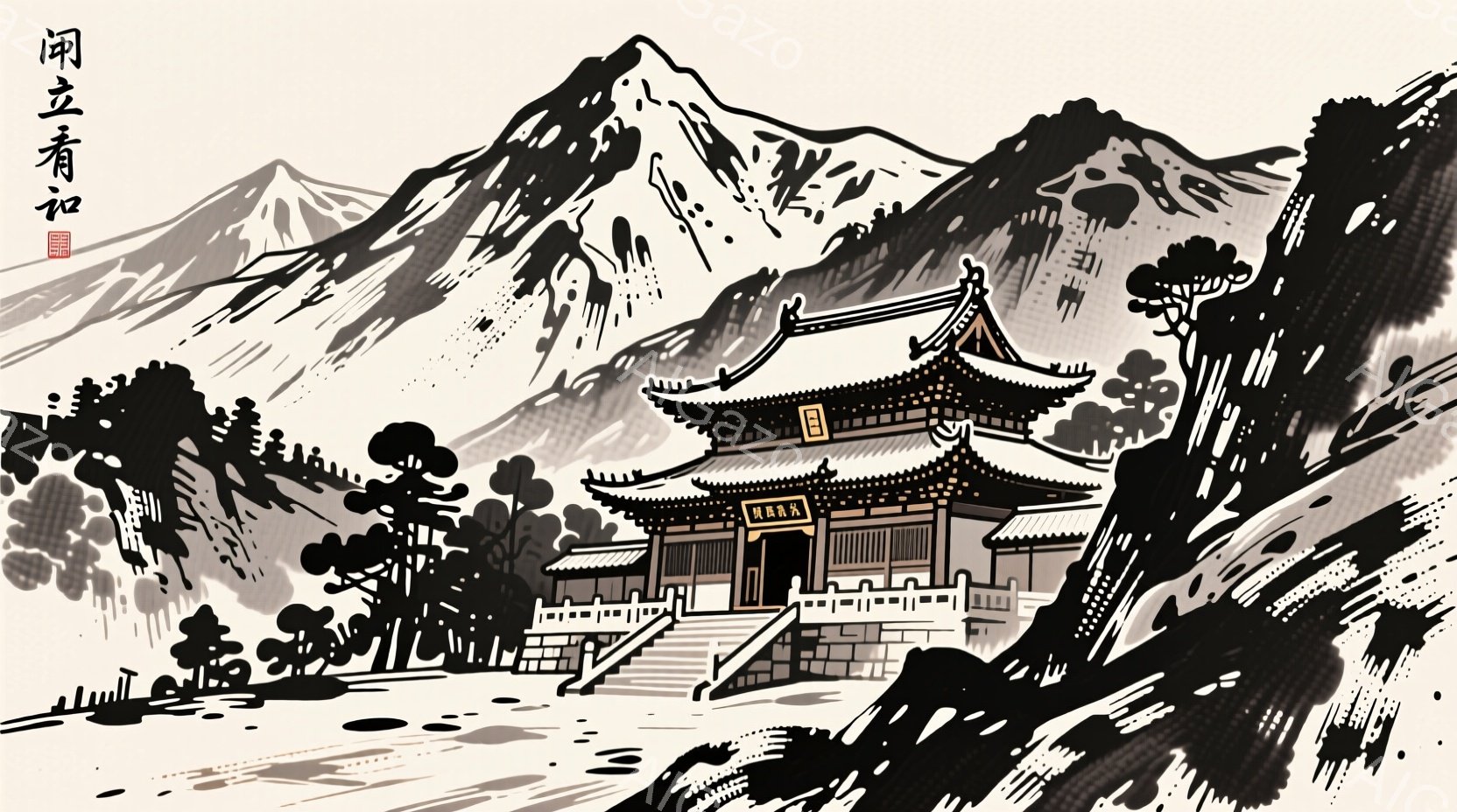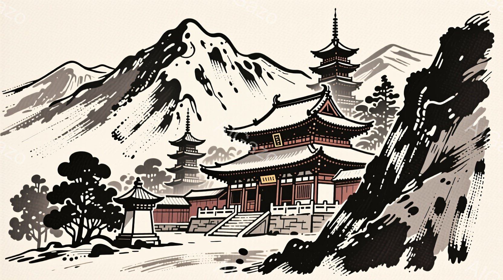 山々に囲まれた寺院が描かれており、重層構造の屋根を持つ壮大な建物が中央に位置しています。寺院の周囲には緑豊かな木々が生い茂り、石段と柵が配置され、静寂で厳かな雰囲気を醸し出しています。全体的に墨絵調で、日本の伝統的な風景画を彷彿とさせる、洗練された印象を与えます。