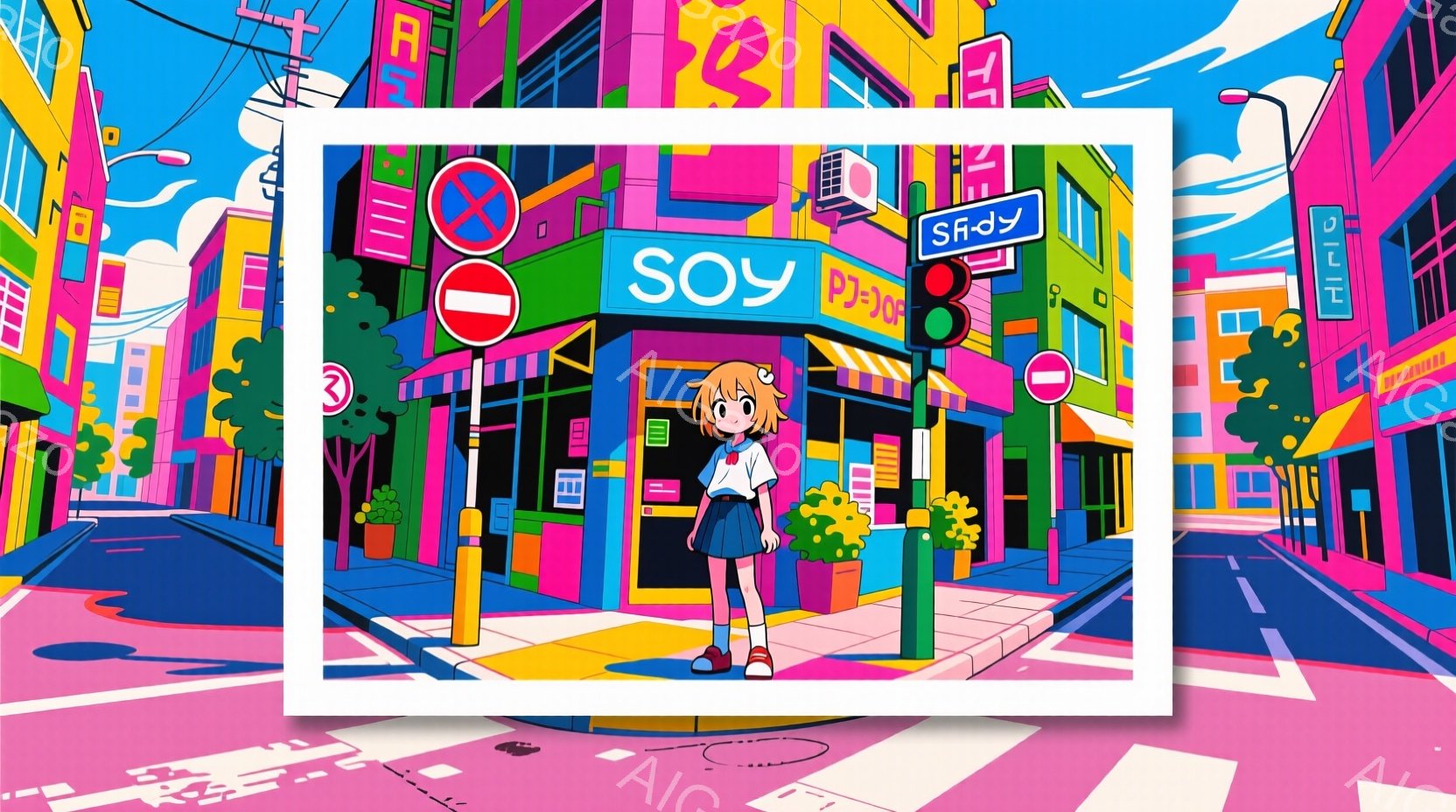 この無料AI生成画像「明るい色彩で描かれた街並みを背景に、若い女性が描かれています。彼女は緑色のトップスと白いスカートを身につけ、黒髪のボブスタイルで、大きな瞳とわずかに微笑んだ表情をしています。背景には、カラフルな建物、植物、そして歩道が描かれており、活気があり、若々しい雰囲気を醸し出しています。」は、2025年10月26日に作成されました。 サイズは 1664×928px の高解像度で、商用利用も可能なフリー素材として提供しています。