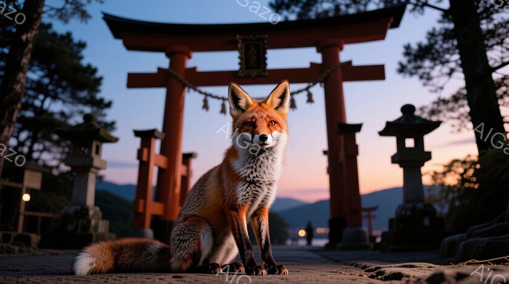 朱色の鳥居が夕焼け空を背景にそびえ立ち、その手前に毛並みの美しい狐が座っている。狐はまっすぐ前を見据え、凛とした表情で周囲を警戒しているようだ。背景には緑豊かな山々が広がり、石畳の道と鳥居の灯りが幻想的な雰囲気を醸し出している。